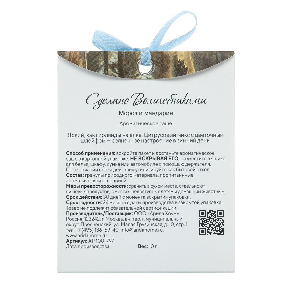 Волшебный новогодний аромат окутывает праздничной атмосферой с первых мгновений. В верхних нотах искрится сочный апельсин, словно россыпь новогодних огней. В сердце композиции расцветает букет из пряной цедры мандарина, изысканной туберозы и нежного цветка апельсина, создавая атмосферу южного Рождества. Благородный шлейф из тёплой ванили и чувственного мускуса обволакивает мягким, уютным облаком, напоминая о семейных традициях и радостных моментах праздника. Этот аромат — настоящая симфония зимнего торжества, где каждая нота дарит ощущение счастья и волшебства. Саше Arida Home отлично подходит для ароматизации малых пространств: комод с бельем, шкаф с вещами, сумка, автомобиль и тд.