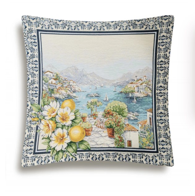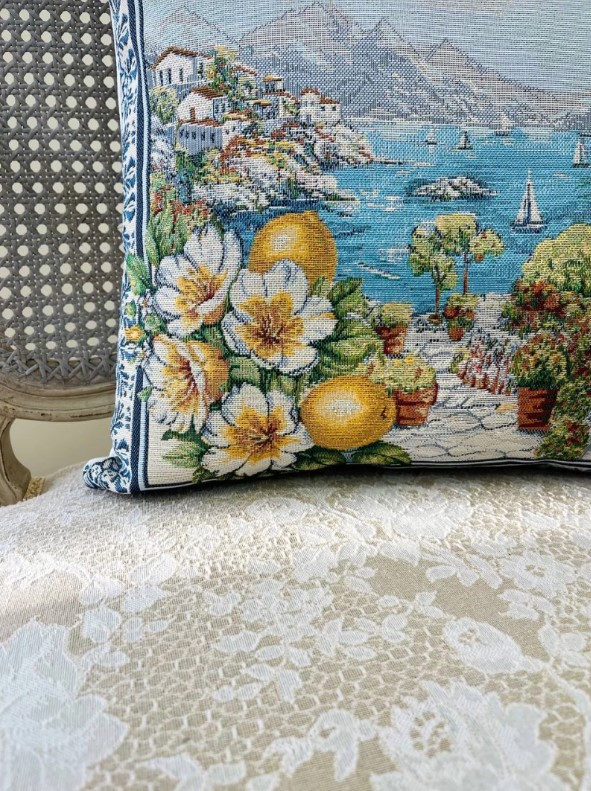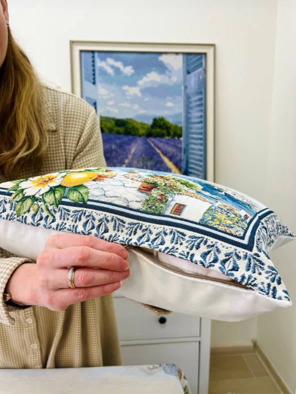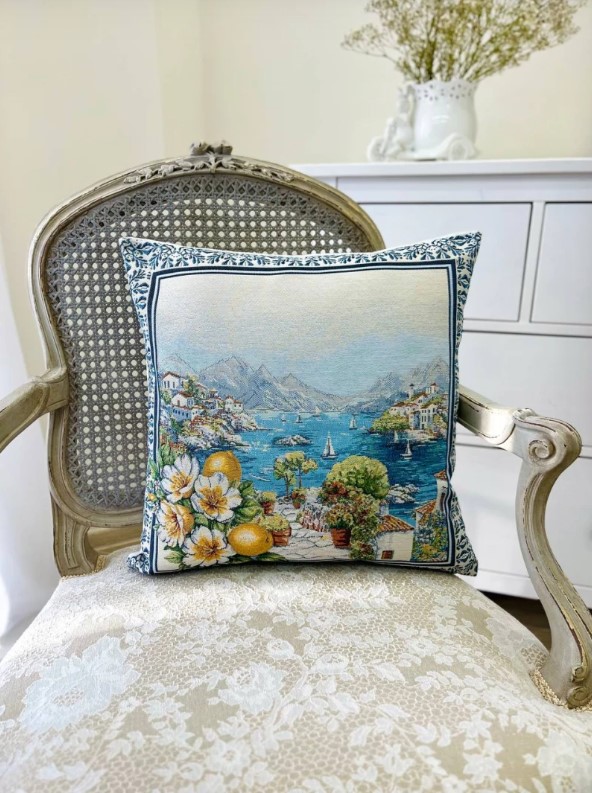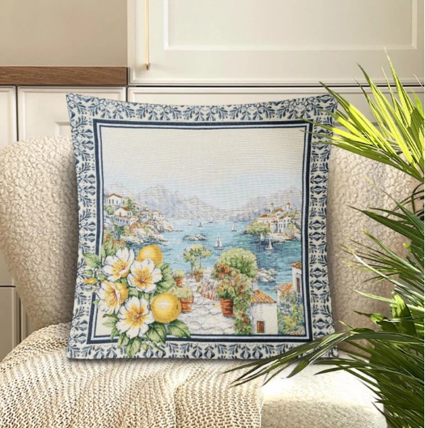 Декоративная гобеленовая наволочка — истинное воплощение средиземноморского шарма в вашем интерьере. На полотне оживает живописный прибрежный пейзаж: лазурная гладь моря, усеянная изящными парусниками, белоснежные домики с терракотовыми крышами, уютно устроившиеся на склонах холмов, и пышные зелёные кустарники в керамических горшках. На переднем плане — сочная композиция из лимонов и нежных белых цветов, добавляющая изделию свежести и летнего настроения. Ткань наволочки сочетает в себе мягкость и практичность, а скрытая молния обеспечивает удобство использования — сменить чехол можно в считанные секунды. Обратная сторона из высококачественного велюра молочного цвета не только приятна на ощупь, но и создаёт гармоничный контраст с ярким лицевым рисунком. Эта наволочка станет изысканным акцентом в гостиной, спальне или на веранде, наполняя пространство атмосферой тёплого побережья и безмятежного отдыха. Позвольте себе кусочек Лиссабона прямо у себя дома — добавьте нотку португальской романтики в повседневную жи