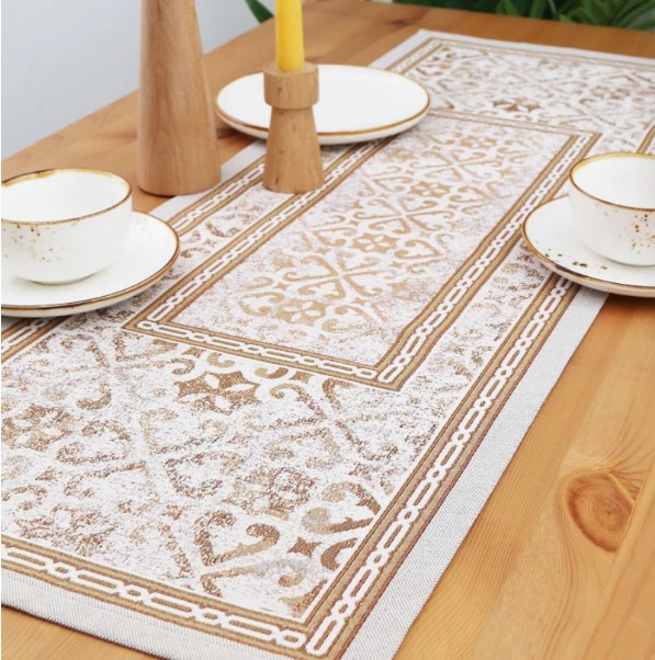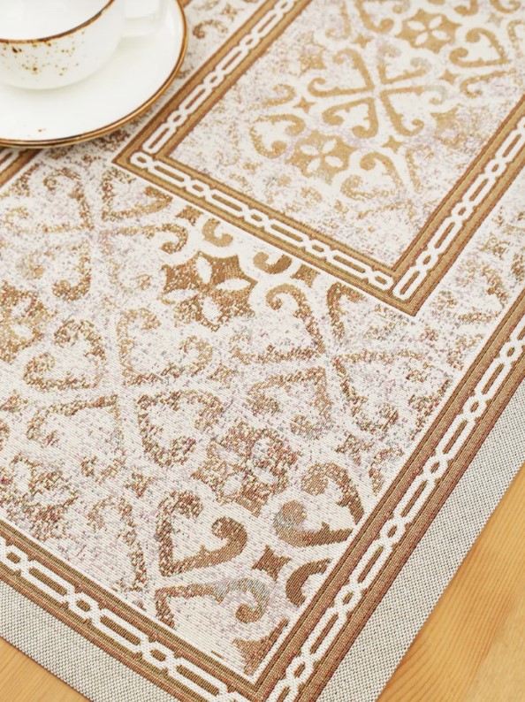 Столовое белье Гобелен можно использовать для сервировки праздничного и повседневного стола, защиты мебели от капель, царапин и горячей посуды, а также в качестве декоративного элемента. Гобелен-ткань с правильным переплетением пряжи, имеющий множество различных оттенков и расцветок. Это плотный и тяжелый материал, сотканный из шерстяных, синтетических и хлопчатобумажных нитей. Благодаря своему составу он еще и экологичен. Гобеленовые узоры – самые прочные и стойкие к истиранию и выцветанию за счет переплетения нитей разных цветов, а не окрашивания ткани.