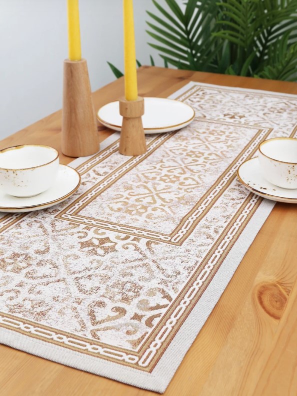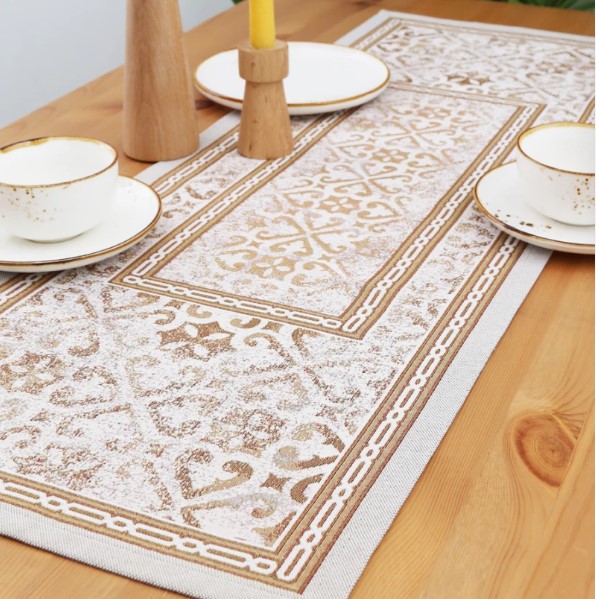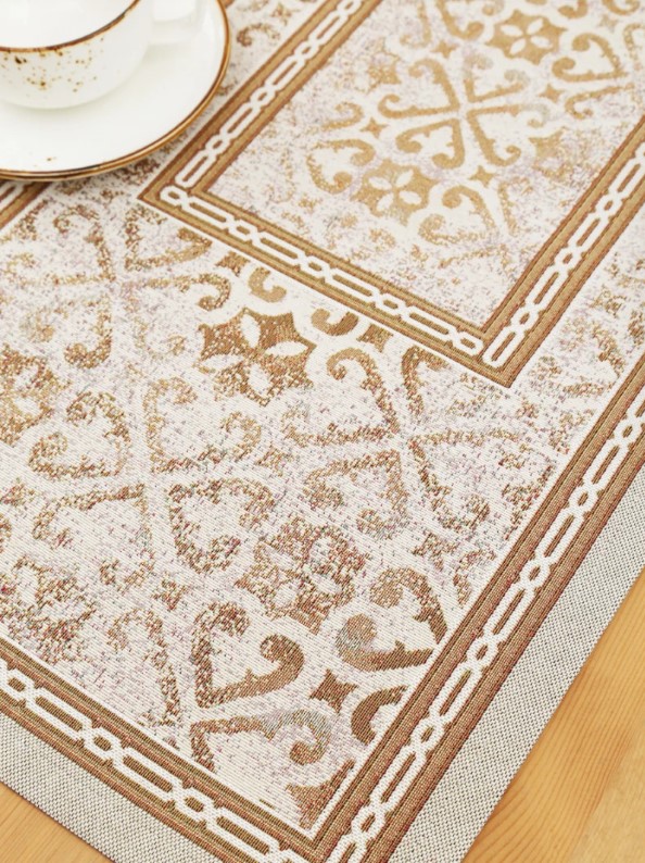 Столовое белье Гобелен можно использовать для сервировки праздничного и повседневного стола, защиты мебели от капель, царапин и горячей посуды, а также в качестве декоративного элемента. Гобелен-ткань с правильным переплетением пряжи, имеющий множество различных оттенков и расцветок. Это плотный и тяжелый материал, сотканный из шерстяных, синтетических и хлопчатобумажных нитей. Благодаря своему составу он еще и экологичен. Гобеленовые узоры – самые прочные и стойкие к истиранию и выцветанию за счет переплетения нитей разных цветов, а не окрашивания ткани.