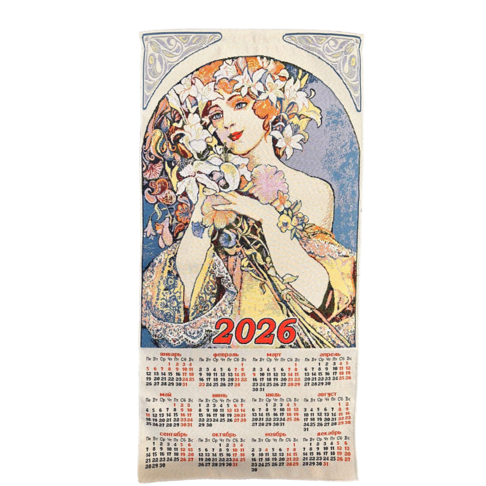 Календарь на 2026 год с символом наступающего года. Изображение выполнено путем сложного жаккардового переплетения цветных нитей. Гобеленовые узоры – самые прочные и стойкие к истиранию и выцветанию. Применение полиэфирного волокна позволяет использовать широкую палитру цветов. По краям полотна вставлена трубочка для формоустойчивости. Календарь из гобелена станет интересным украшением интерьера и отличным подарком к Новому году.