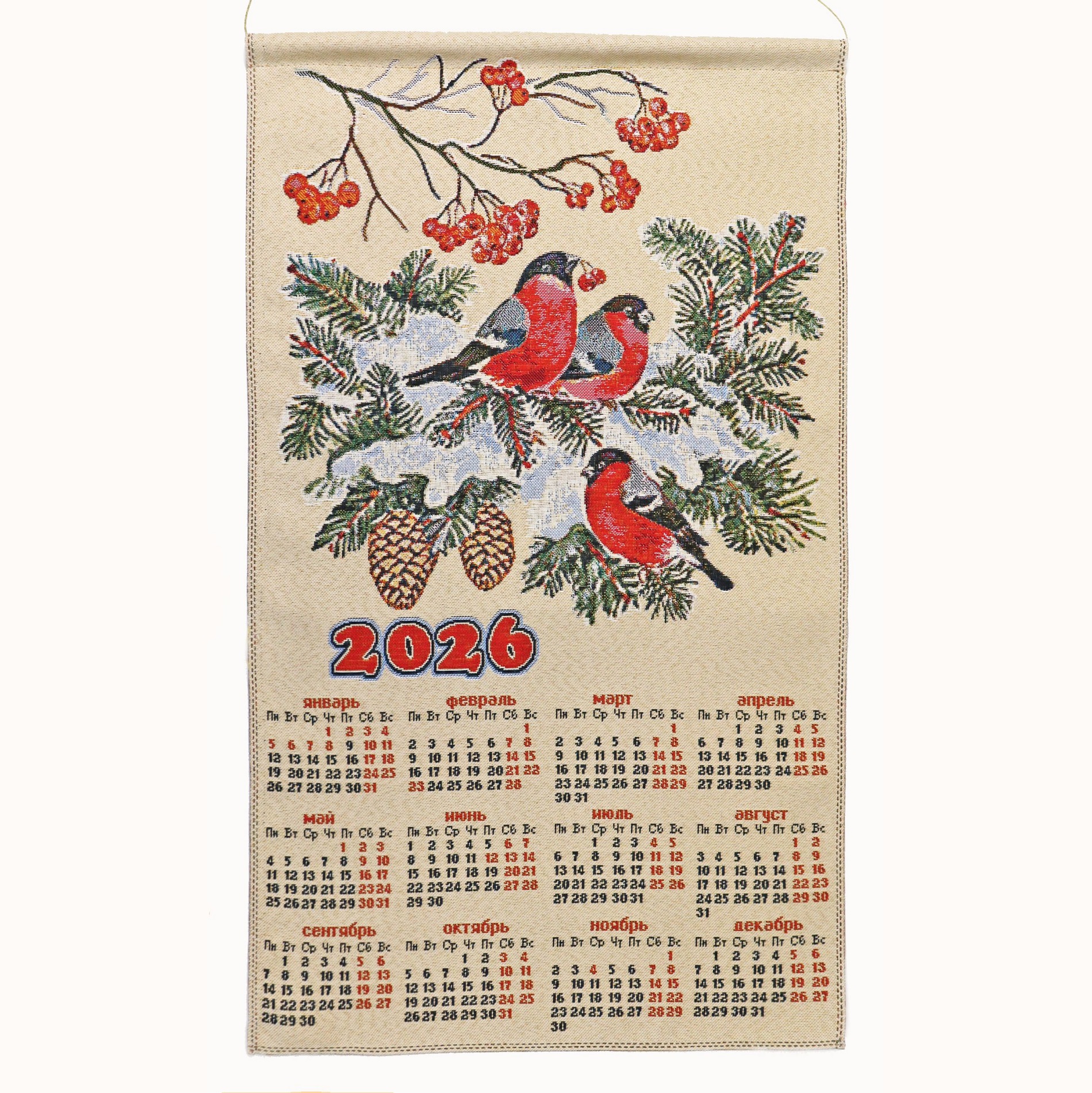 Календарь на 2026 год с символом наступающего года. Изображение выполнено путем сложного жаккардового переплетения цветных нитей. Гобеленовые узоры – самые прочные и стойкие к истиранию и выцветанию. Применение полиэфирного волокна позволяет использовать широкую палитру цветов. По краям полотна вставлена трубочка для формоустойчивости. Календарь из гобелена станет интересным украшением интерьера и отличным подарком к Новому году.