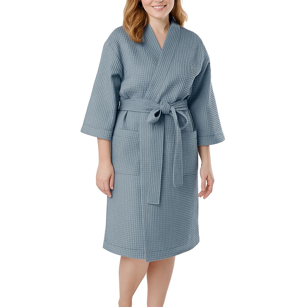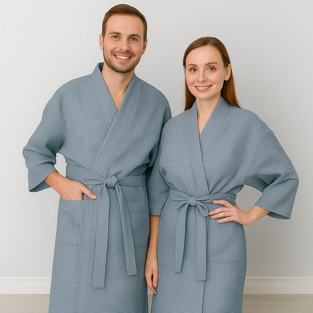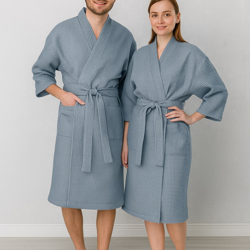 Универсальный вафельный халат станет идеальным выбором как для домашнего использования в любое время года, так и для посещения бани, бассейна, спа-салонов. Натуральная вафельная ткань из хлопка, отлично пропускает воздух, обладает отличной гигроскопичностью и дает коже дышать, поэтому в теплое время года (летом и весной) в этом халате можно чувствовать себя комфортно и уютно. В холодное время года вафельные халаты также будут очень удобны и практичны, поскольку они достаточно плотные и хорошо удерживают тепло. Очень легкие халаты, не сковывают движений и вызывают ощущение комфорта и свободы. Воротник кимоно, карманы и манжеты рукава отделаны однотонным кантом, что придает данным халатам некую строгость и выдержанность в классическом стиле.