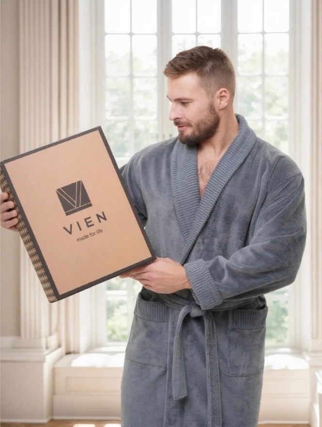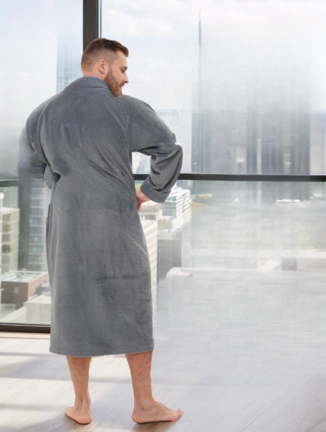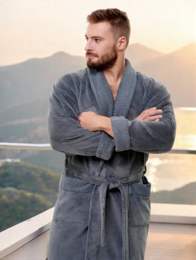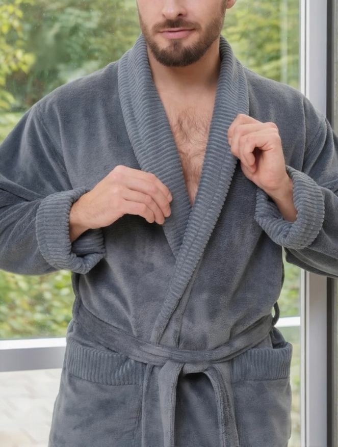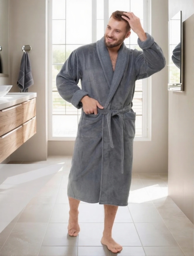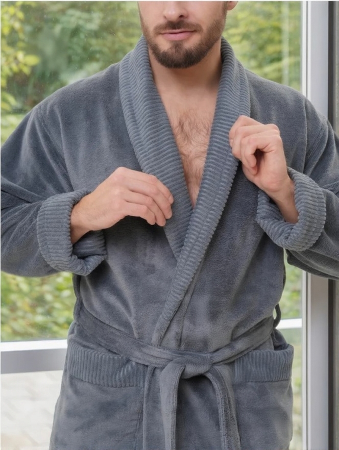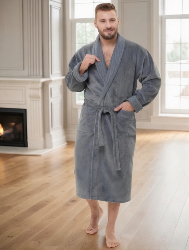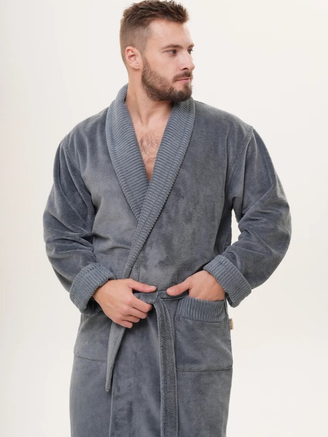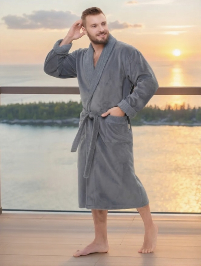 Стильный банный халат из мужской коллекции ROMANOV согреет вас своим теплом. Изготовлен из турецкой ткани Double touch bamboo по современной уникальной технологии. Внутренний слой натуральный бамбуковое волокно на хлопковой основе, а верхний - велюр из микрофибры. Халат выполнен в элегантном стиле с жаккардовой отделкой по воротнику - шалька, манжетам и карманам. Запах регулируется широким поясом. Однотонный мягкий велюровый модный халат для мужчин в лаконичных трендовых расцветках. Изделие сделано точно в размер, поэтому идеально сядет на любую фигуру.
