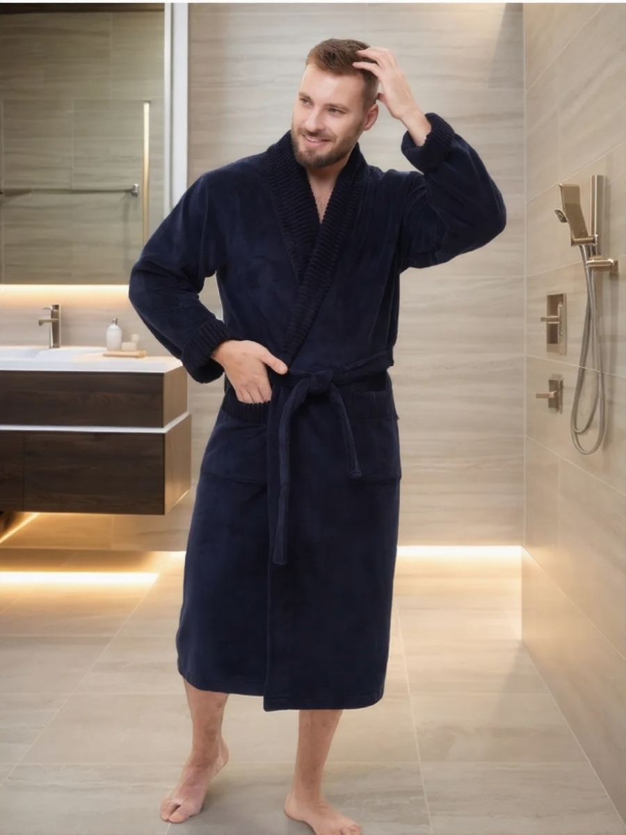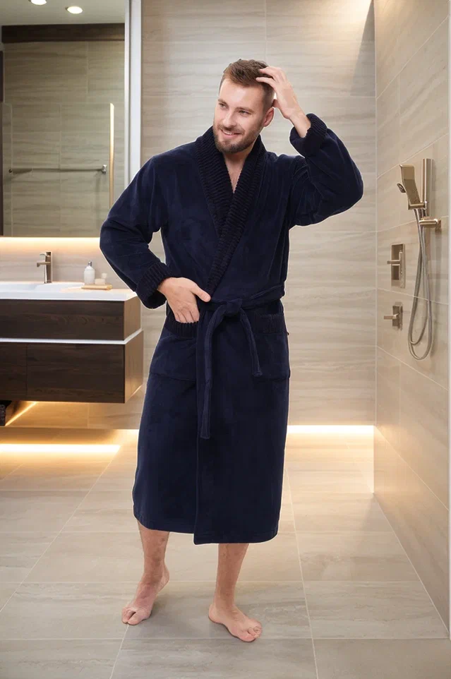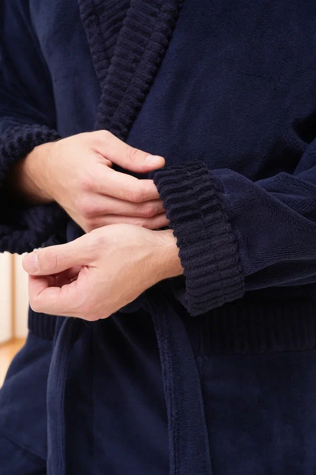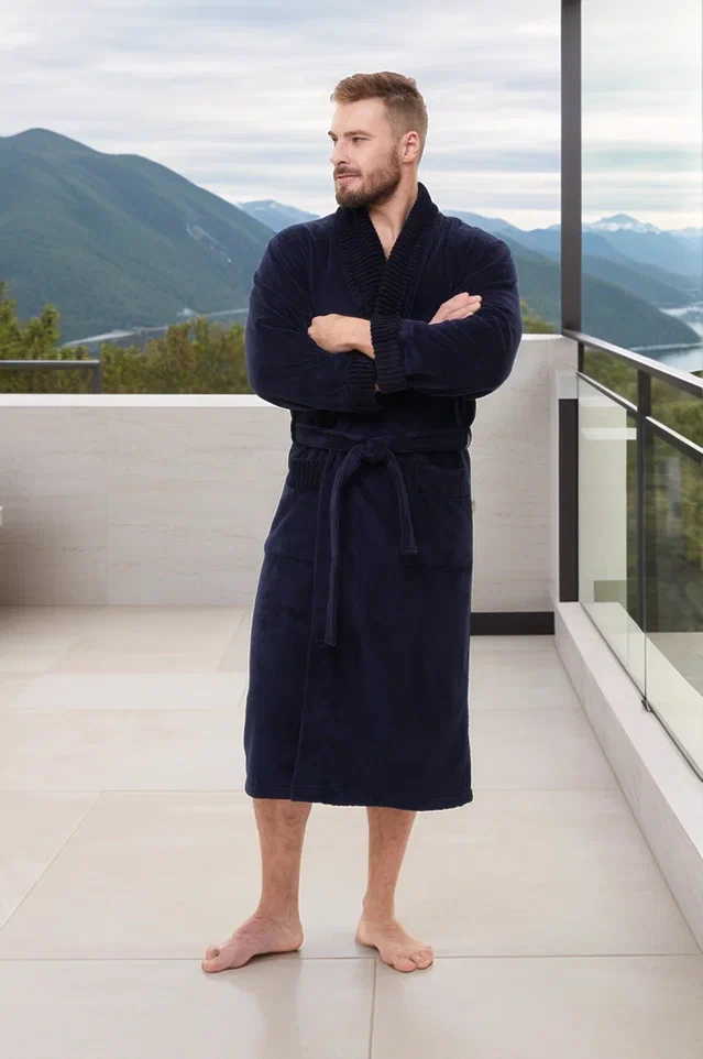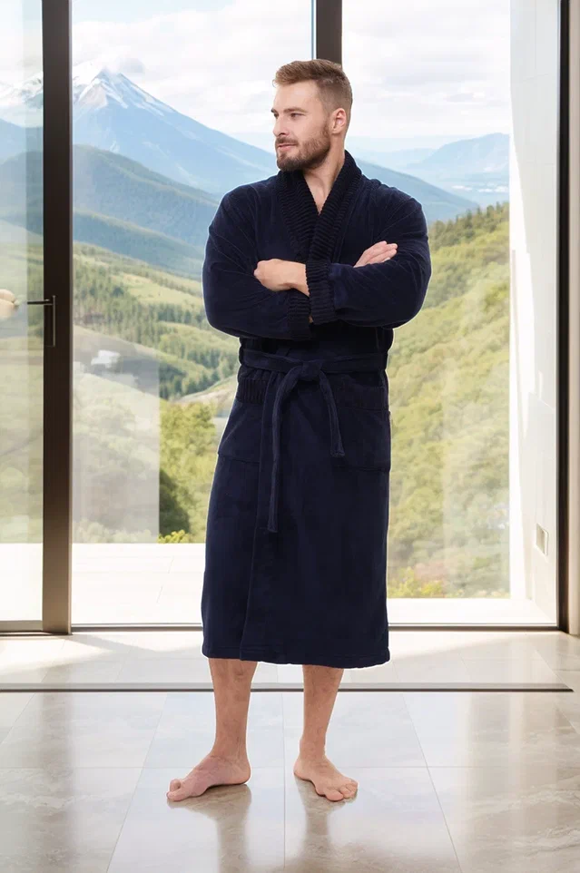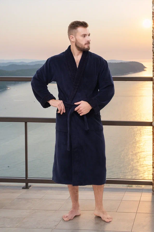 Стильный банный халат из мужской коллекции ROMANOV согреет вас своим теплом. Изготовлен из турецкой ткани Double touch bamboo по современной уникальной технологии. Внутренний слой натуральный бамбуковое волокно на хлопковой основе, а верхний - велюр из микрофибры. Халат выполнен в элегантном стиле с жаккардовой отделкой по воротнику - шалька, манжетам и карманам. Запах регулируется широким поясом. Однотонный мягкий велюровый модный халат для мужчин в лаконичных трендовых расцветках. Изделие сделано точно в размер, поэтому идеально сядет на любую фигуру.