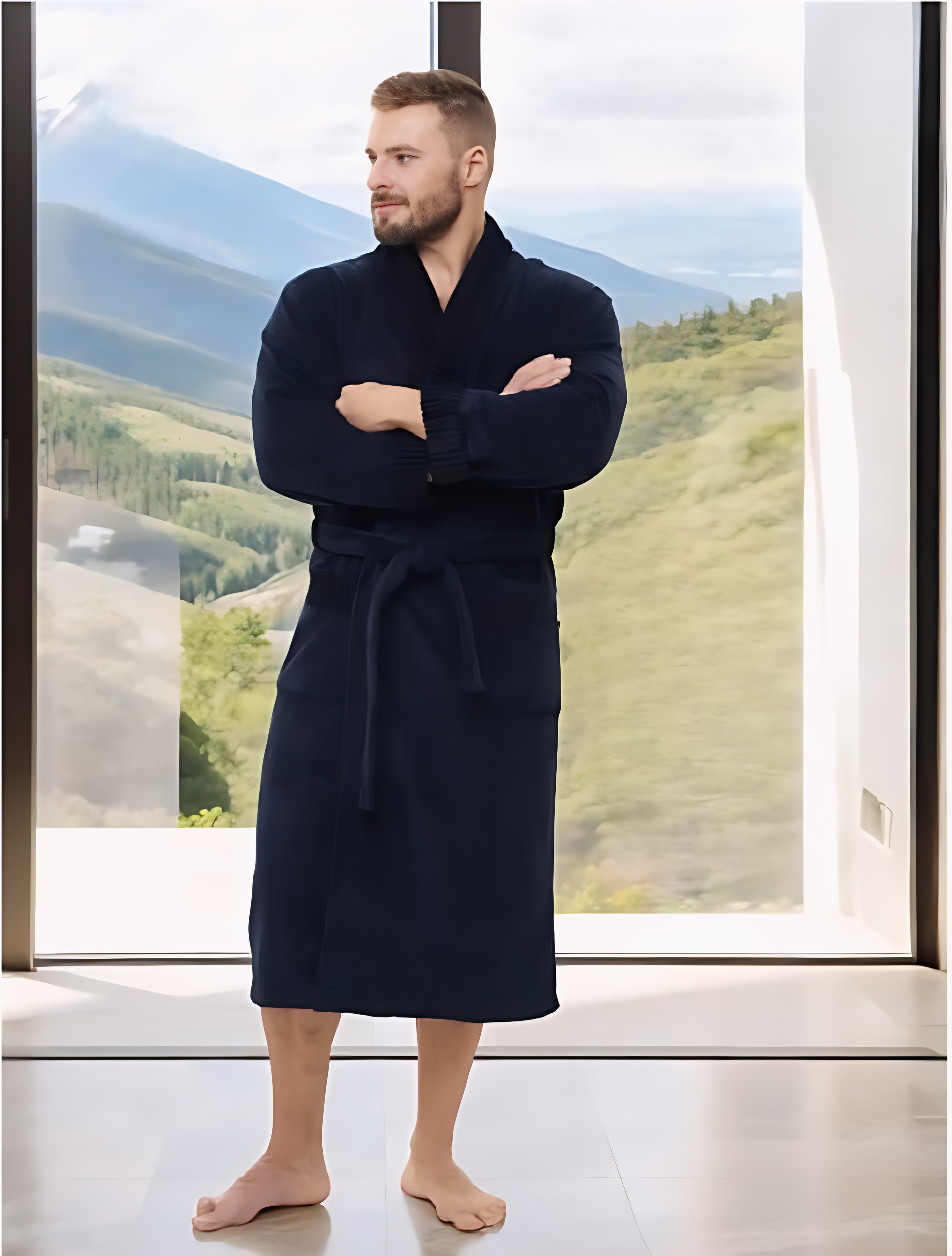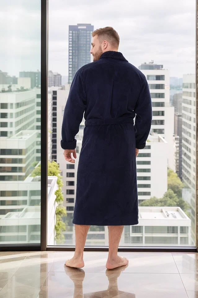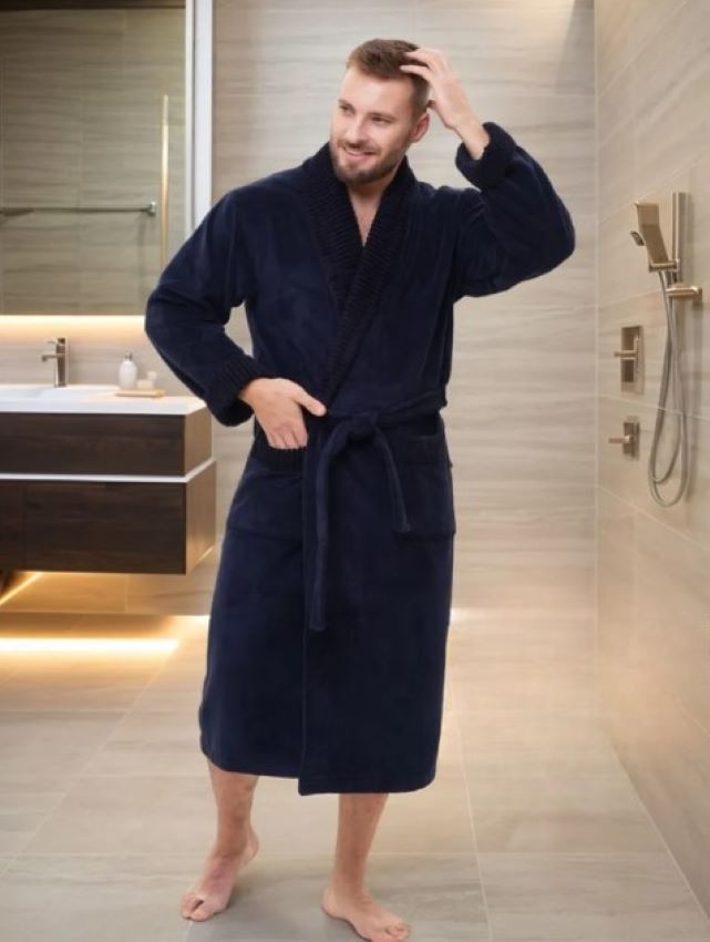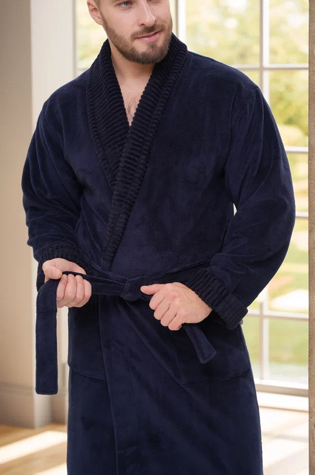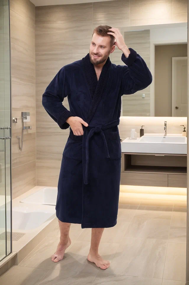 Стильный банный халат из мужской коллекции ROMANOV согреет вас своим теплом. Изготовлен из турецкой ткани Double touch bamboo по современной уникальной технологии. Внутренний слой натуральный бамбуковое волокно на хлопковой основе, а верхний - велюр из микрофибры. Халат выполнен в элегантном стиле с жаккардовой отделкой по воротнику - шалька, манжетам и карманам. Запах регулируется широким поясом. Однотонный мягкий велюровый модный халат для мужчин в лаконичных трендовых расцветках. Изделие сделано точно в размер, поэтому идеально сядет на любую фигуру.