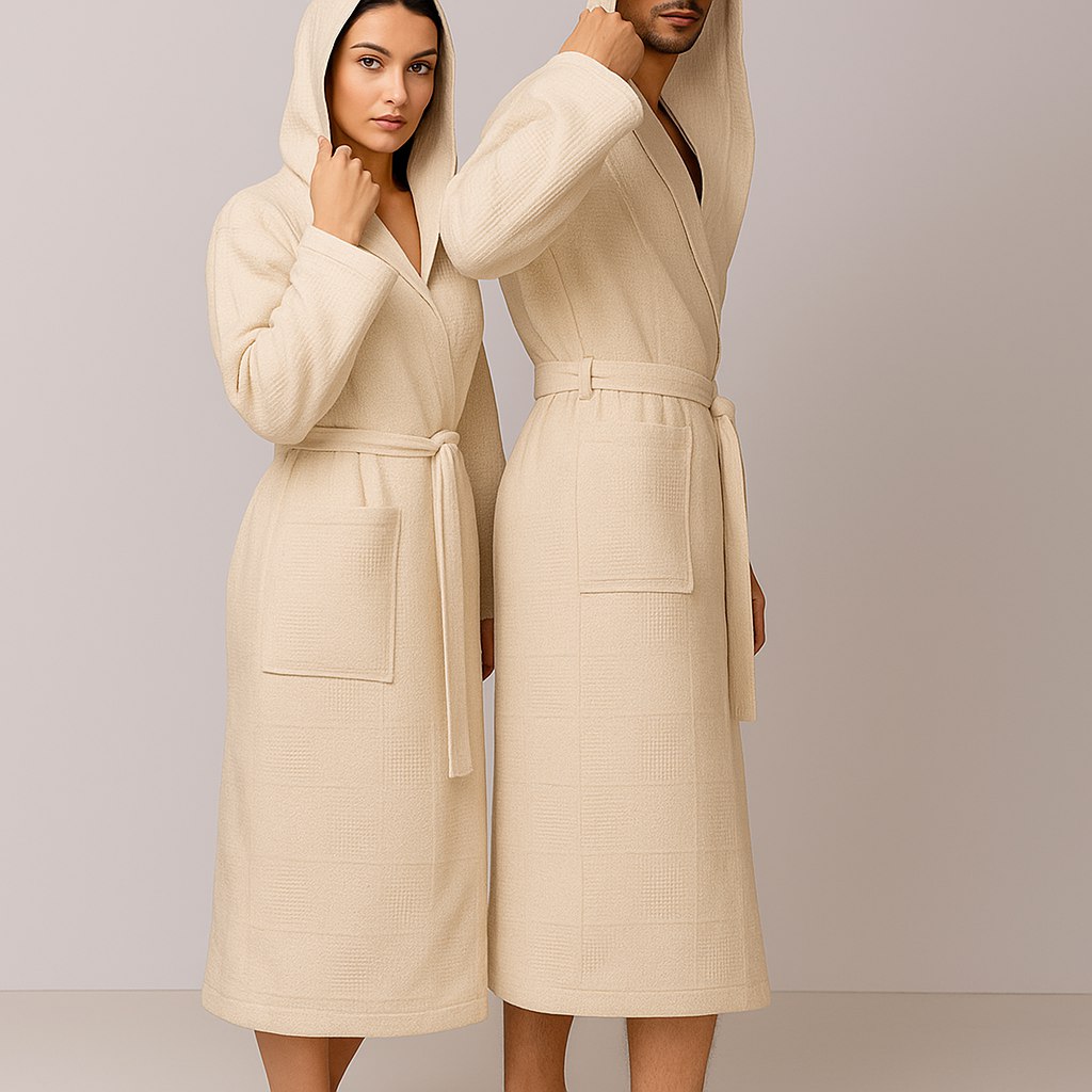 Такие халаты прекрасно впитывают влагу, быстро сохнут, а рельефный рисунок в структуре ткани обеспечивает массажный эффект и принесет эстетическое удовольствие.