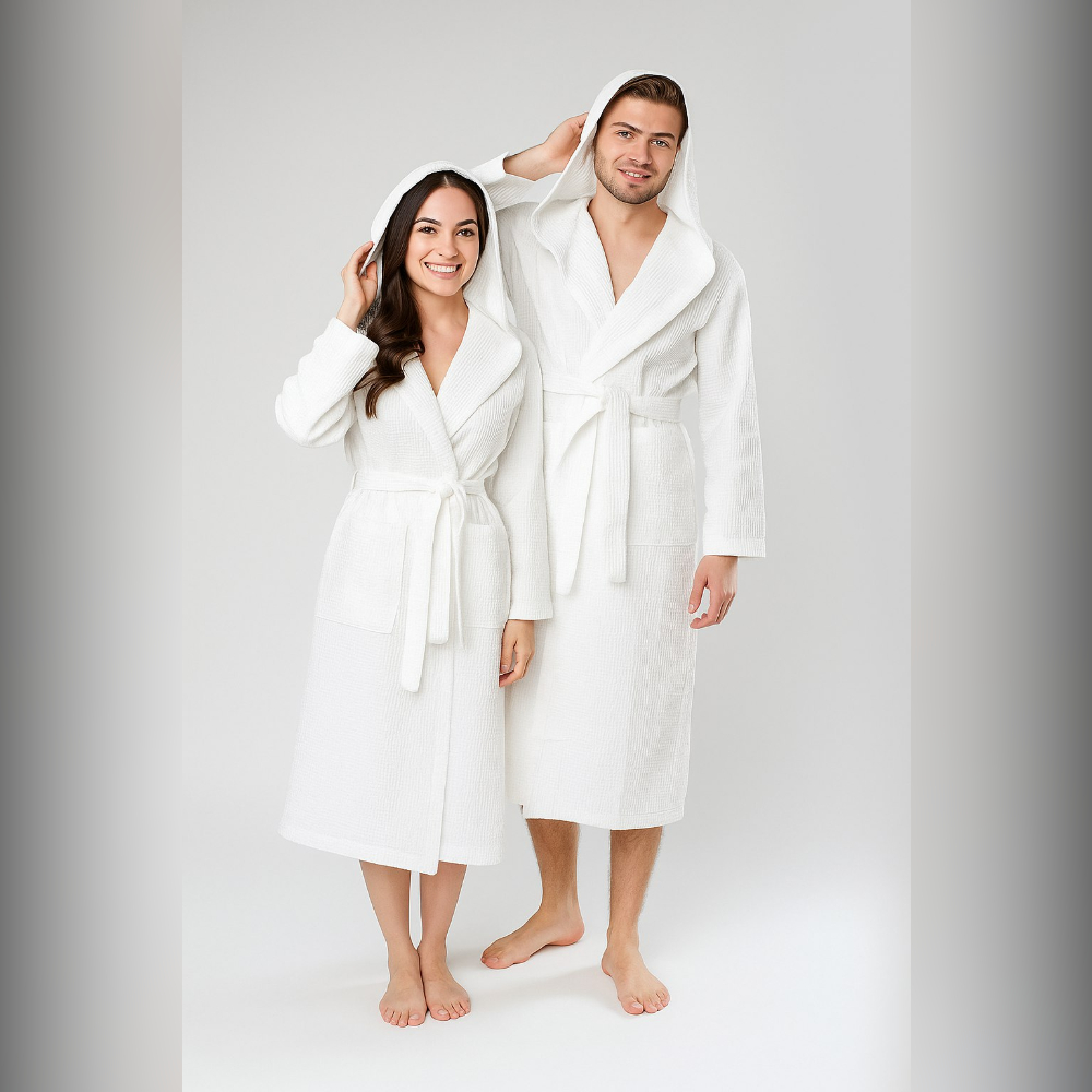 Такие халаты прекрасно впитывают влагу, быстро сохнут, а рельефный рисунок в структуре ткани обеспечивает массажный эффект и принесет эстетическое удовольствие.