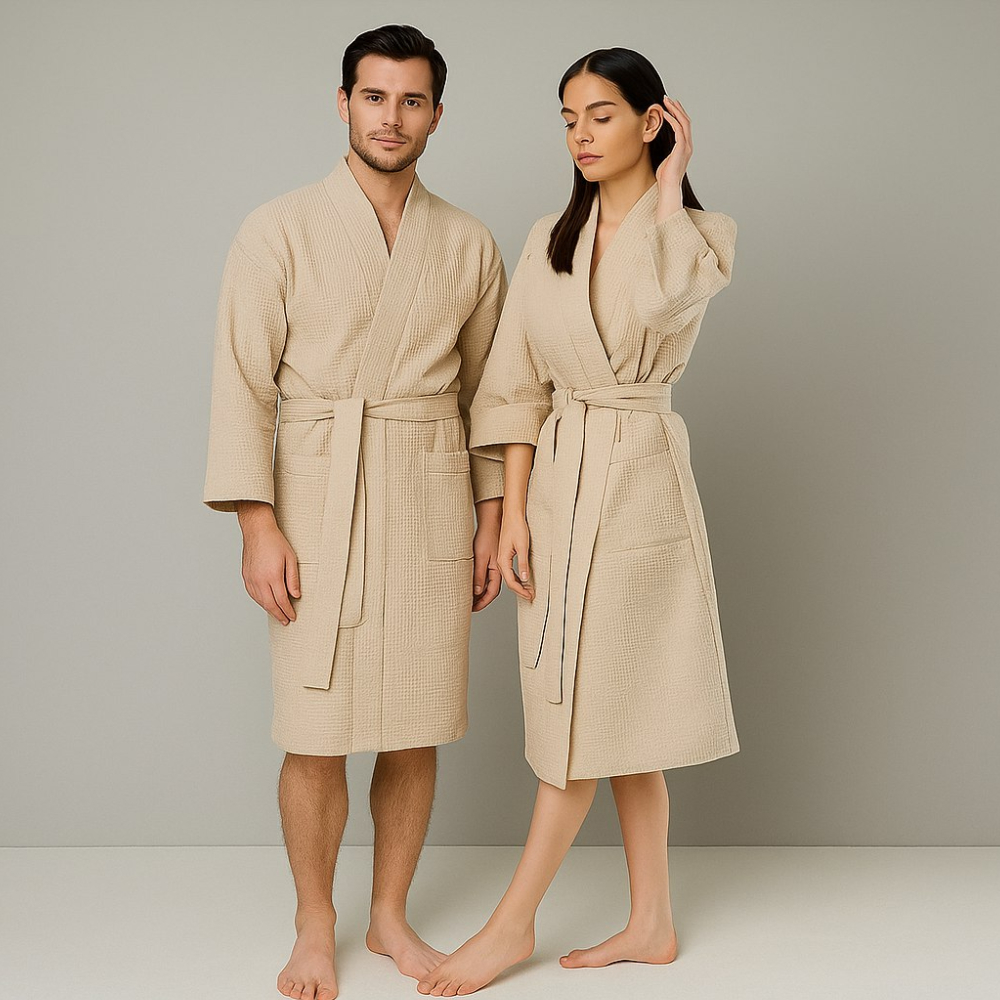 Такие халаты прекрасно впитывают влагу, быстро сохнут, а рельефный рисунок в структуре ткани обеспечивает массажный эффект и принесет эстетическое удовольствие.