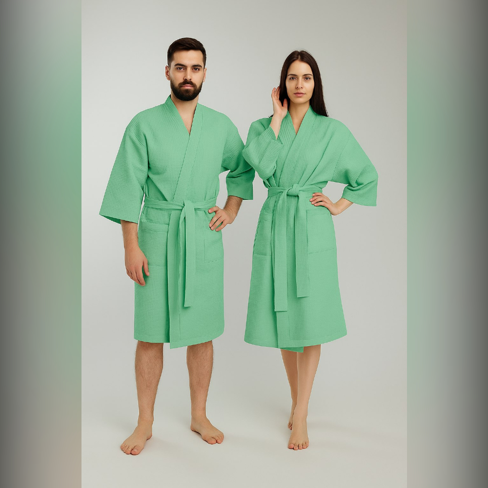 Универсальный вафельный халат станет идеальным выбором как для домашнего использования в любое время года, так и для посещения бани, бассейна, спа-салонов. Натуральная вафельная ткань из хлопка, отлично пропускает воздух, обладает отличной гигроскопичностью и дает коже дышать, поэтому в теплое время года (летом и весной) в этом халате можно чувствовать себя комфортно и уютно. В холодное время года вафельные халаты также будут очень удобны и практичны, поскольку они достаточно плотные и хорошо удерживают тепло. Очень легкие халаты, не сковывают движений и вызывают ощущение комфорта и свободы. Воротник кимоно, карманы и манжеты рукава отделаны однотонным кантом, что придает данным халатам некую строгость и выдержанность в классическом стиле.