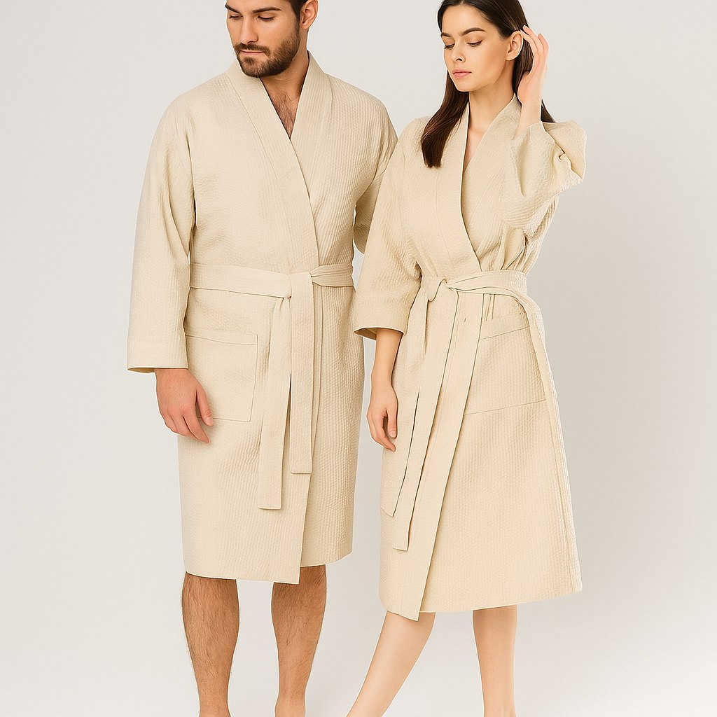 Такие халаты прекрасно впитывают влагу, быстро сохнут, а рельефный рисунок в структуре ткани обеспечивает массажный эффект и принесет эстетическое удовольствие.