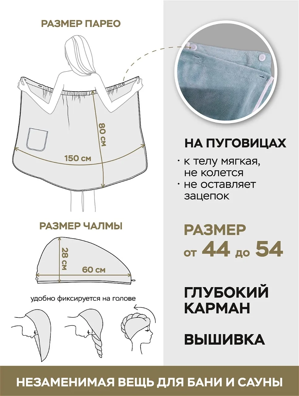 Комплект для сауны: килт на пуговицах и чалма — ваш ключ к комфорту и расслаблению в любых условиях! Бамбук в составе придаёт изделию антибактериальные свойства, хлопок обеспечивает мягкость, а микрофибра — долговечность. Не теряет форму после множества стирок, быстро сохнет. Махровая ткань плотностью 380 г/м² обеспечивает превосходную впитываемость — вы мгновенно осушите кожу после парной, не испытывая дискомфорта.