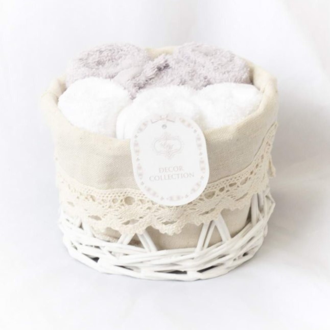 Декоративные салфетки из 100% хлопка представлены в нескольких цветовых решениях, прекрасно впитывают влагу и придают ощущение нежности. Салфетки упакованы в подарочную корзинку, которая будет одинаково хорошо смотреться как на кухне, так и в ванной комнате.