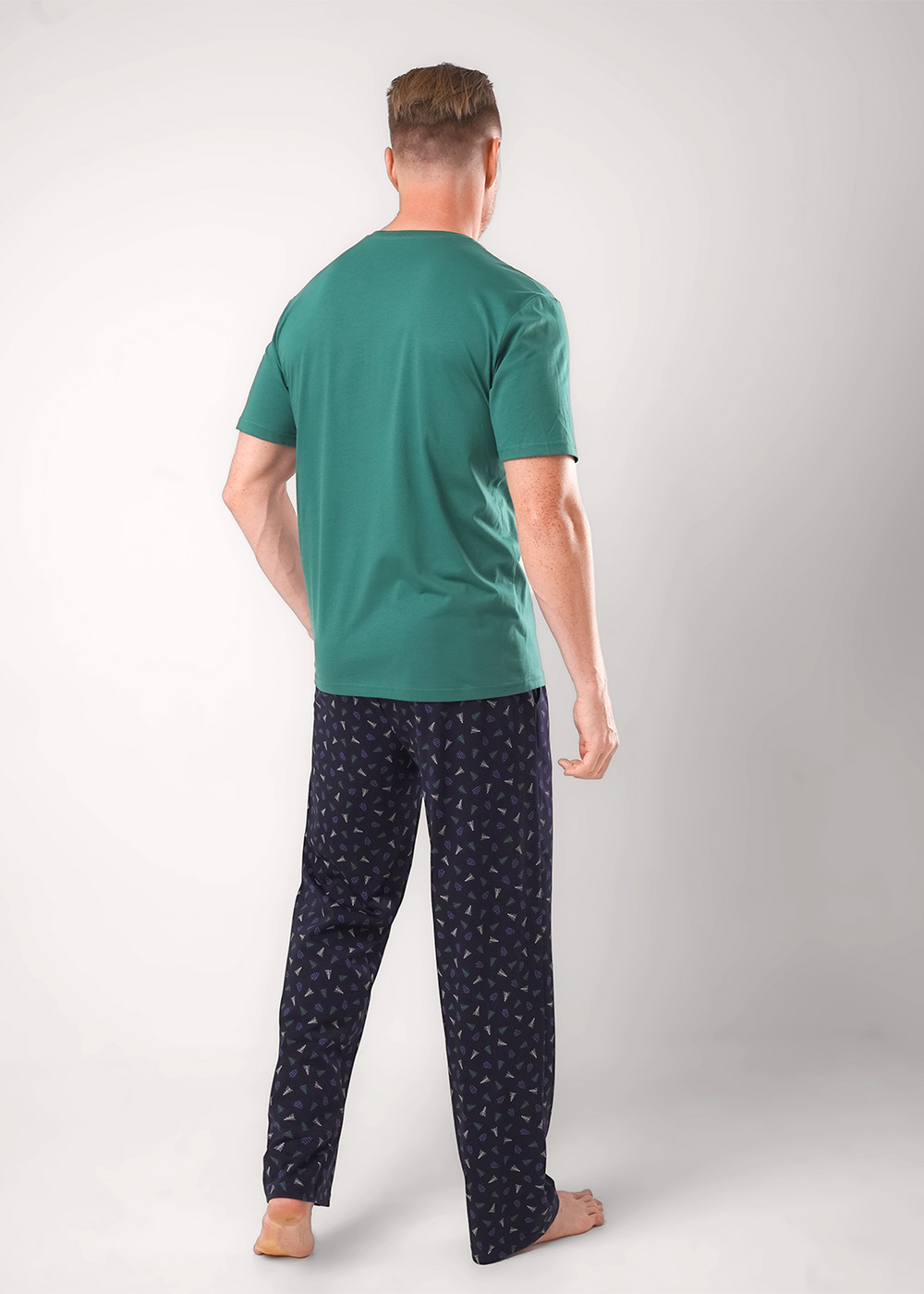 Мужская пижама «Clever» — это стильный и комфортный комплект для дома. Темно-зеленая футболка с коротким рукавом украшена ярким принтом с изображением медведя и надписью «Wild Holidays», что добавляет образу оригинальности. Брюки выполнены из мягкого материала с мелким узором, обеспечивающим уют и удобство. Этот комплект идеально подходит для отдыха и сна, сочетая практичность и модный дизайн.