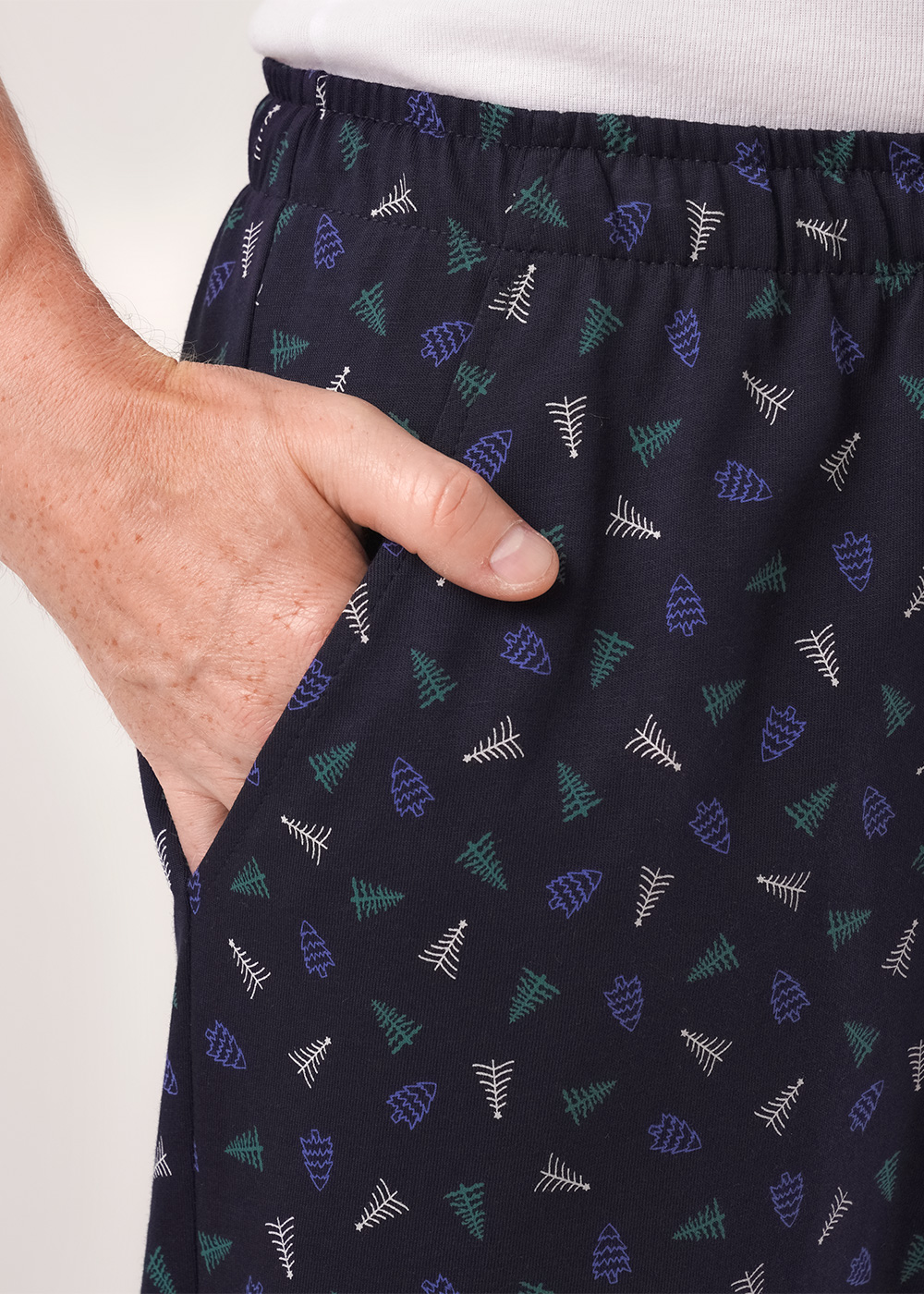 Мужская пижама «Clever» — это стильный и комфортный комплект для дома. Темно-зеленая футболка с коротким рукавом украшена ярким принтом с изображением медведя и надписью «Wild Holidays», что добавляет образу оригинальности. Брюки выполнены из мягкого материала с мелким узором, обеспечивающим уют и удобство. Этот комплект идеально подходит для отдыха и сна, сочетая практичность и модный дизайн.