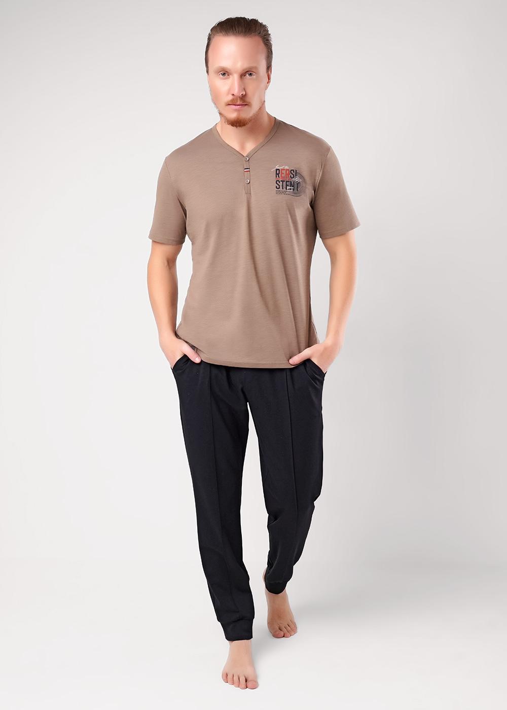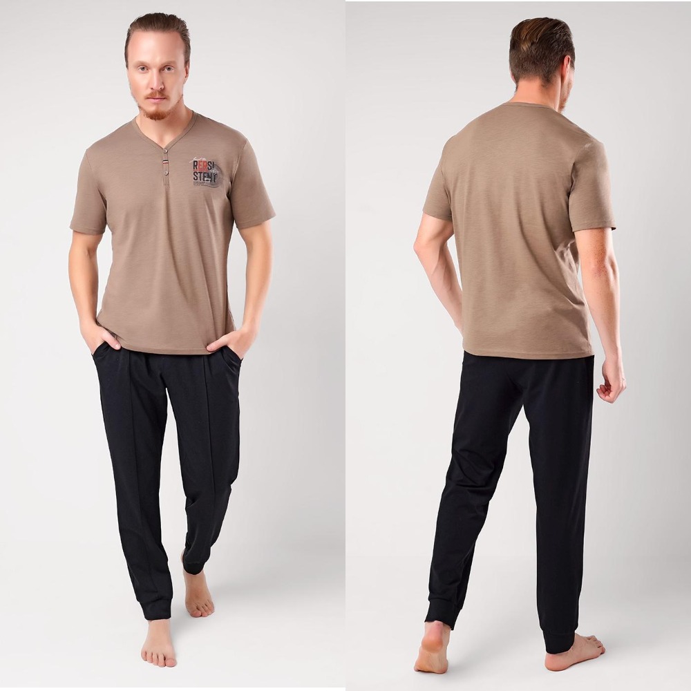 Комплект мужской — практичное и стильное решение для домашнего комфорта. Этот уютный набор состоит из футболки и брюк, созданных для максимального удобства в повседневной носке. Футболка выполнена в спокойном кофейном оттенке, имеет лаконичный V-образный вырез с декоративными пуговицами, придающими модели изюминку. На груди расположен небольшой принт, который добавляет образу индивидуальности, не перегружая его. Короткий рукав обеспечивает свободу движений, а мягкая ткань приятно прилегает к телу. Брюки выполнены в классическом чёрном цвете, имеют свободный крой, который не стесняет движений. Эластичные манжеты на щиколотках надёжно фиксируют брюки, предотвращая их сползание, а эластичный пояс обеспечивает идеальную посадку по фигуре. Практичные боковые карманы позволяют хранить мелкие предметы под рукой. Комплект идеален для домашнего отдыха, сна или расслабленного времяпрепровождения.