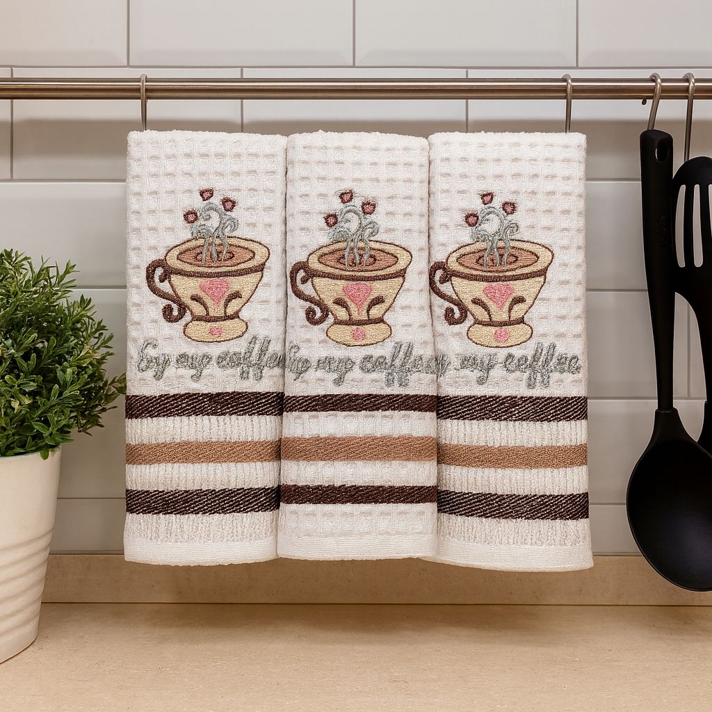 Комплект полотенец турецкого производителя Метеор (Meteor) изготовленные из 100% хлопка, созданы для бережного ухода за посудой и функционального использования в быту. Полотенца изготовлены из вафельного полотна, обладают хорошими впитывающими свойствами. Структура ткани позволяет воздуху свободно проникать через волокна, что позволяет полотенцу быстрее высыхать. Благодаря натуральному составу полотенца обладают отличной износостойкостью, прочностью и будут служить Вам долгое время. Отличаются мягкостью и гипоаллергенностью. Простой процесс ухода. После стирки не линяют и не выцветают, имеют устойчивое окрашивание. В комплект входит 3 полотенца, размером 35*45 см. Три гармоничных, натуральных оттенка создадут на вашей кухне уютную атмосферу, а процесс приготовления пищи более комфортным. Полотенца имеют отделку в виде вышивки, подходят для декорирования стола. Подарочные кухонные полотенца – это всегда желанный подарок для любой хозяйки. Как презент на любой праздник или для повседневного использования.