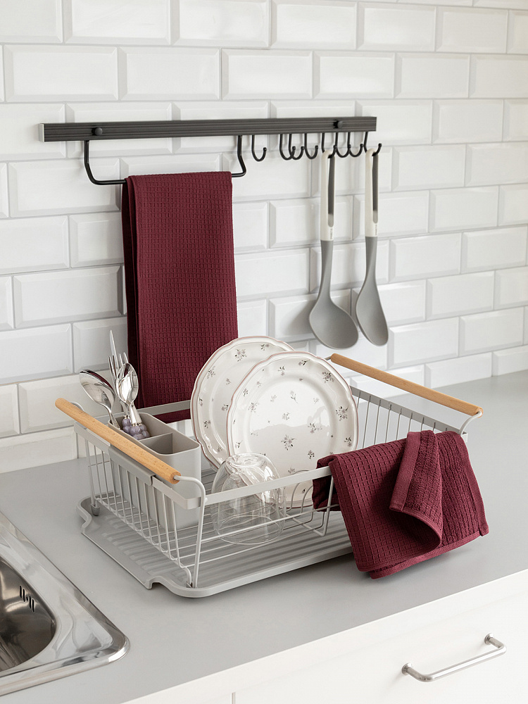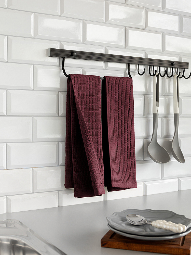 Кухонные полотенца DeNastia изготовлены из мягкого двустороннего полотна. Одна сторона вафельная, вторая махровая. Полотенце сочетает в себе преимущества обоих видов: быстрое высыхание за счет ячеестой структуры, увеличенный объем впитываемой жидкости и отсутствие частиц ворса на посуде. Повышенная плотность делает изделия более прочными и позволяет надолго сохранить цвет и форму. Хлопок натуральный, не обработан химическими компонентами, после стирки возможна усадка. Благодаря лаконичному дизайну полотенца идеально впишутся в интерьер, для удобства использования имеется петелька для подвеса на полотенцедержатель. При правильном уходе за полотенцами для кухни они не потеряют внешний вид при повседневном использовании и стирке.