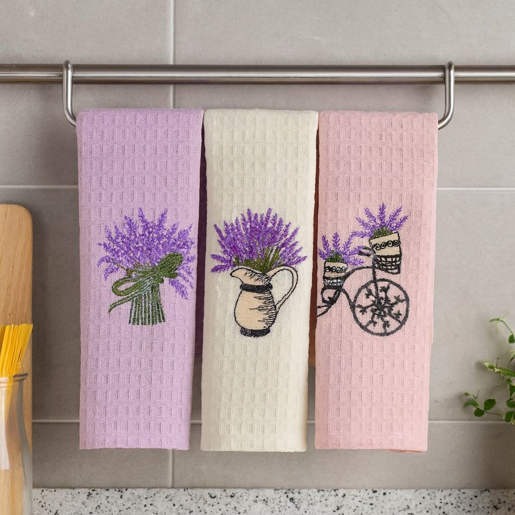 Комплект полотенец турецкого производителя Метеор (Meteor) изготовленные из 100% хлопка, созданы для бережного ухода за посудой и функционального использования в быту. Полотенца изготовлены из вафельного полотна, обладают хорошими впитывающими свойствами. Структура ткани позволяет воздуху свободно проникать через волокна, что позволяет полотенцу быстрее высыхать. Благодаря натуральному составу полотенца обладают отличной износостойкостью, прочностью и будут служить Вам долгое время. Отличаются мягкостью и гипоаллергенностью. Простой процесс ухода. После стирки не линяют и не выцветают, имеют устойчивое окрашивание. В комплект входит 3 полотенца, размером 40*60 см. Три гармоничных, натуральных оттенка создадут на вашей кухне уютную атмосферу, а процесс приготовления пищи более комфортным. Полотенца имеют отделку в виде лавандовой вышивки. Подарочные кухонные полотенца – это хороший подарок для любой хозяйки. Как презент на праздник или для повседневного использования.