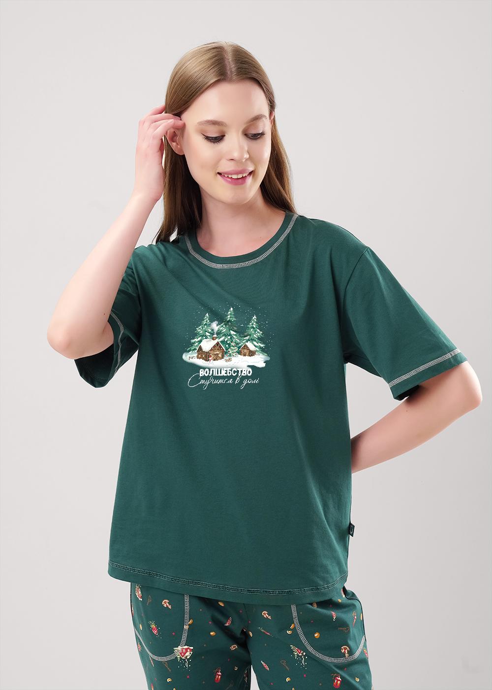 Пижама из трикотажного полотна — это идеальный выбор для комфортного отдыха дома. Комплект состоит из футболки с коротким втачным рукавом и бриджей. Футболка украшена принтом спереди и нашивкой в боковом шве, что добавляет стильности. По горловине выполнена обтачка с застилом, а низ футболки оформлен застилом. Бриджи оснащены поясом на внутренней резинке и киперной лентой, что обеспечивает удобную посадку. Боковые карманы с отрезным бочком и застилом добавляют практичности. Этот комплект сочетает комфорт и стиль, идеально подходя для домашнего отдыха.