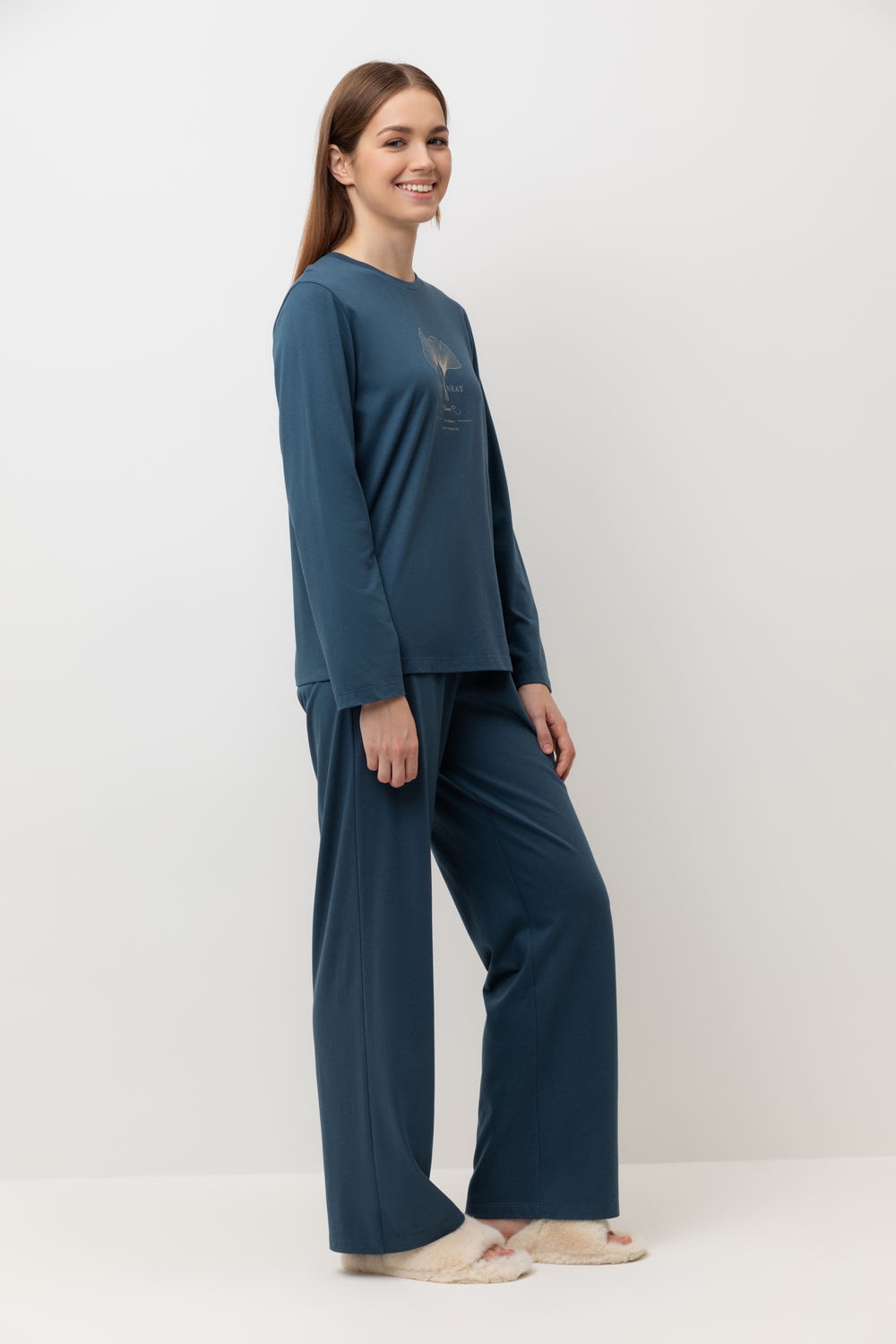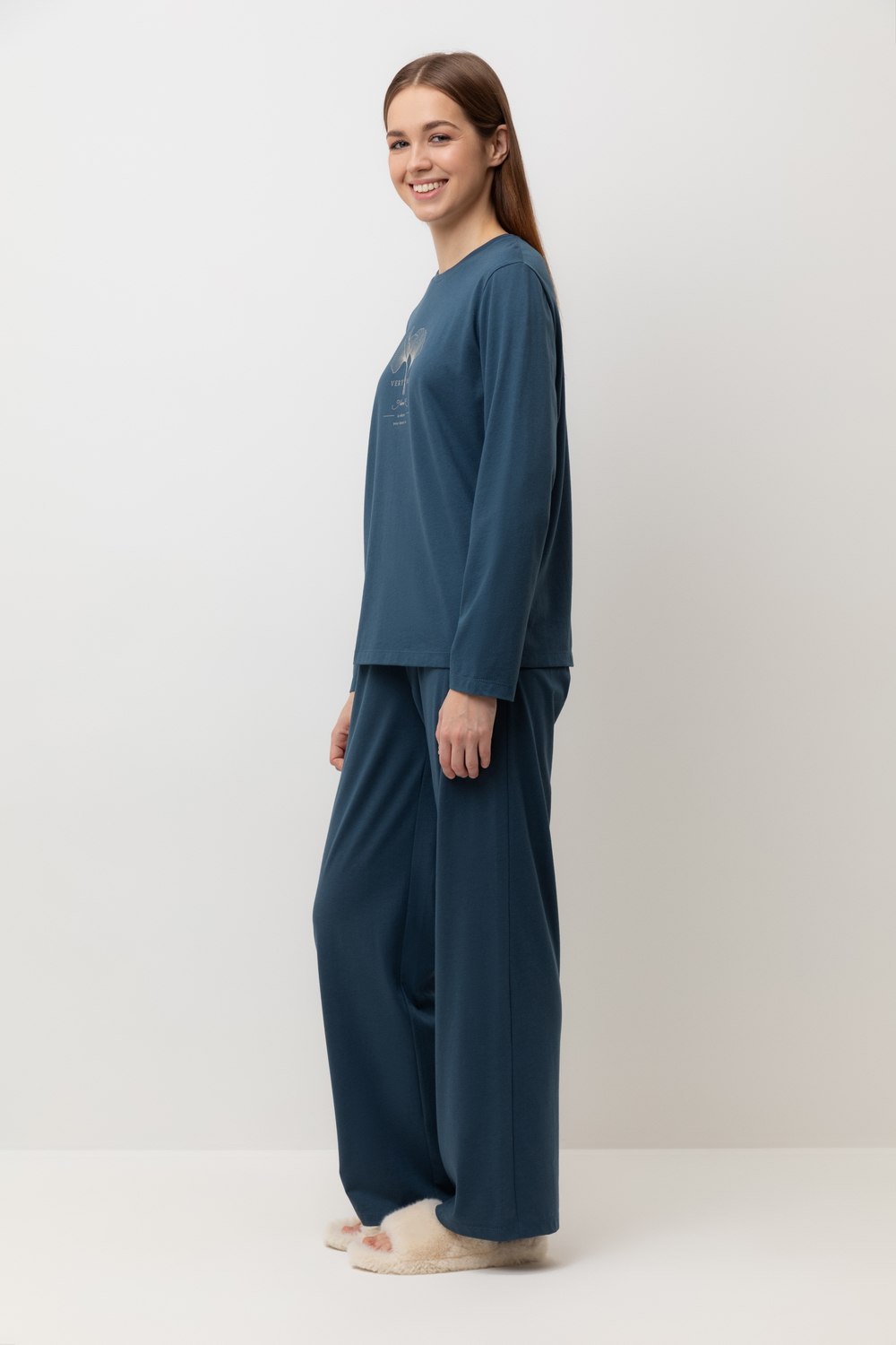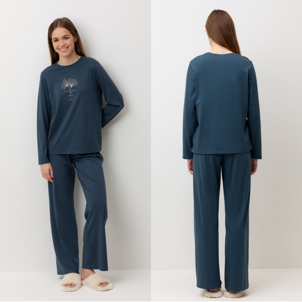 Женский комплект из мягкой ткани, сочетающей 60% хлопка и 40% модала, — идеальный выбор для домашнего уюта и комфорта. Практичный и стильный комплект состоит из свободной кофты с длинными рукавами и круглым вырезом, украшенной изящным принтом, а также широких брюк, которые обеспечивают полную свободу движений.Сочетание хлопка и модала придаёт изделию особые преимущества: натуральная хлопковая составляющая гарантирует отличную воздухопроницаемость и гипоаллергенность, а волокна модала добавляют ткани шелковистую гладкость, лёгкую эластичность и повышенную износостойкость. Благодаря такому составу комплект не только приятен на ощупь, но и долго сохраняет первоначальный вид даже после множества стирок — не деформируется, не теряет цвет и не покрывается катышками. Спокойный, глубокий оттенок комплекта легко впишется в любой интерьер, а лаконичный дизайн подойдёт для повседневной домашней одежды. Комплект прекрасно подойдёт для отдыха после насыщенного дня — в нём будет комфортно в любое время года.