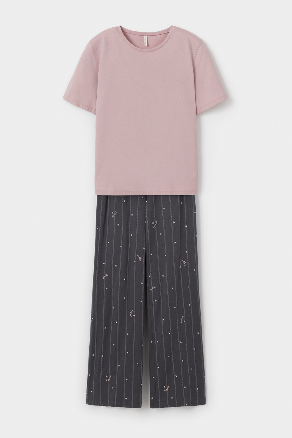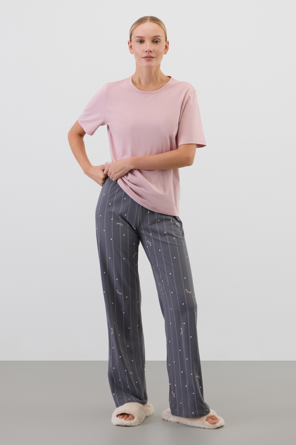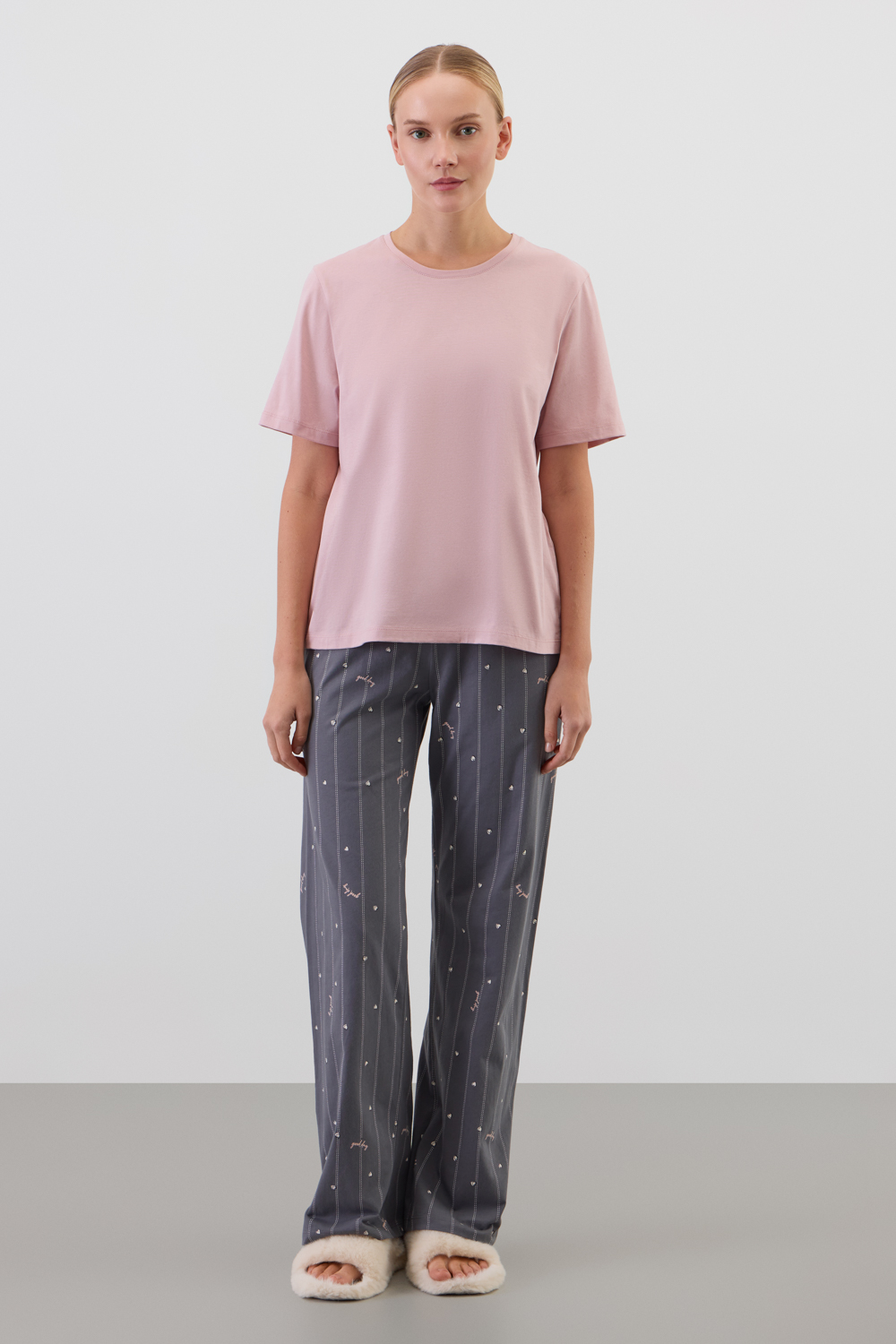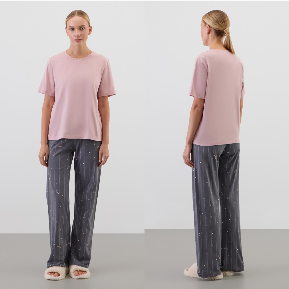 Пижама из 100% хлопка — это идеальный выбор для комфортного сна и отдыха. Комплект выполнен из мягкого и дышащего материала, который обеспечивает приятные тактильные ощущения и комфорт в течение всей ночи.Пижама состоит из футболки с короткими рукавами и брюк прямого кроя. Свободная футболка имеет круглую горловину, которая обеспечивает лёгкость движений и не сковывает тело. Брюки оснащены эластичным поясом, обеспечивающим комфорт и свободу движений.Комплект выполнен в спокойных, нейтральных тонах, которые легко впишутся в любой интерьер спальни или гостиной. Лёгкий принт на брюках добавляет образу изюминку, не перегружая его. Эта домашняя одежда подойдёт как для сна, так и для повседневных дел — она не теряет форму после стирки, не вызывает аллергии и сохраняет первоначальную мягкость даже при длительном использовании. Практичный и стильный комплект станет незаменимой частью вашего домашнего гардероба, даря ощущение уюта и расслабленности каждый день.