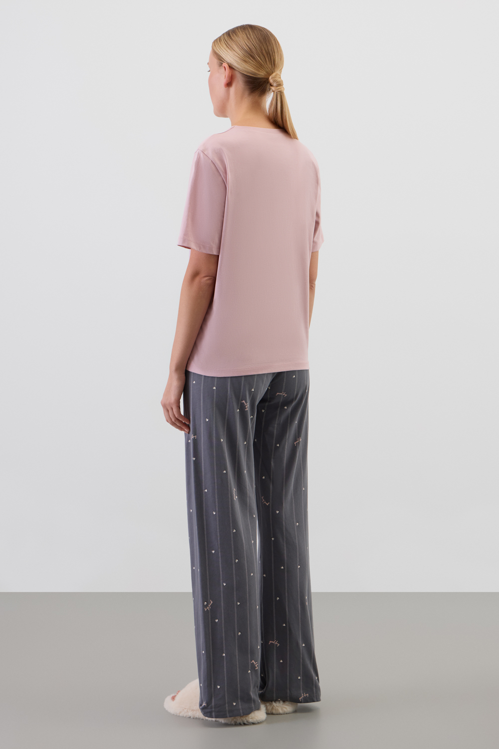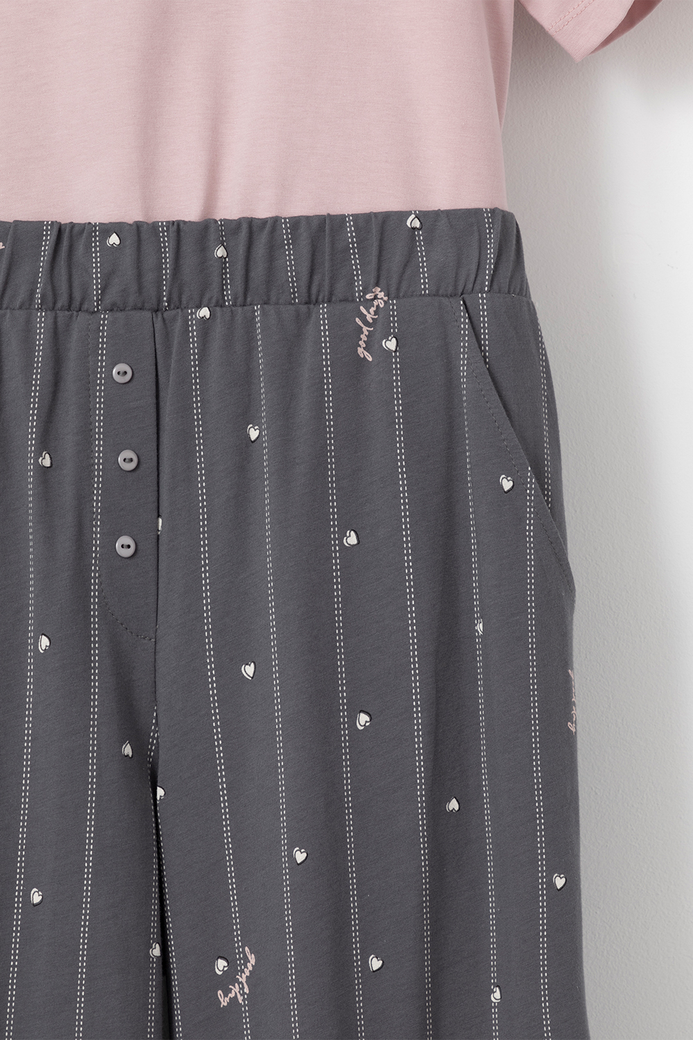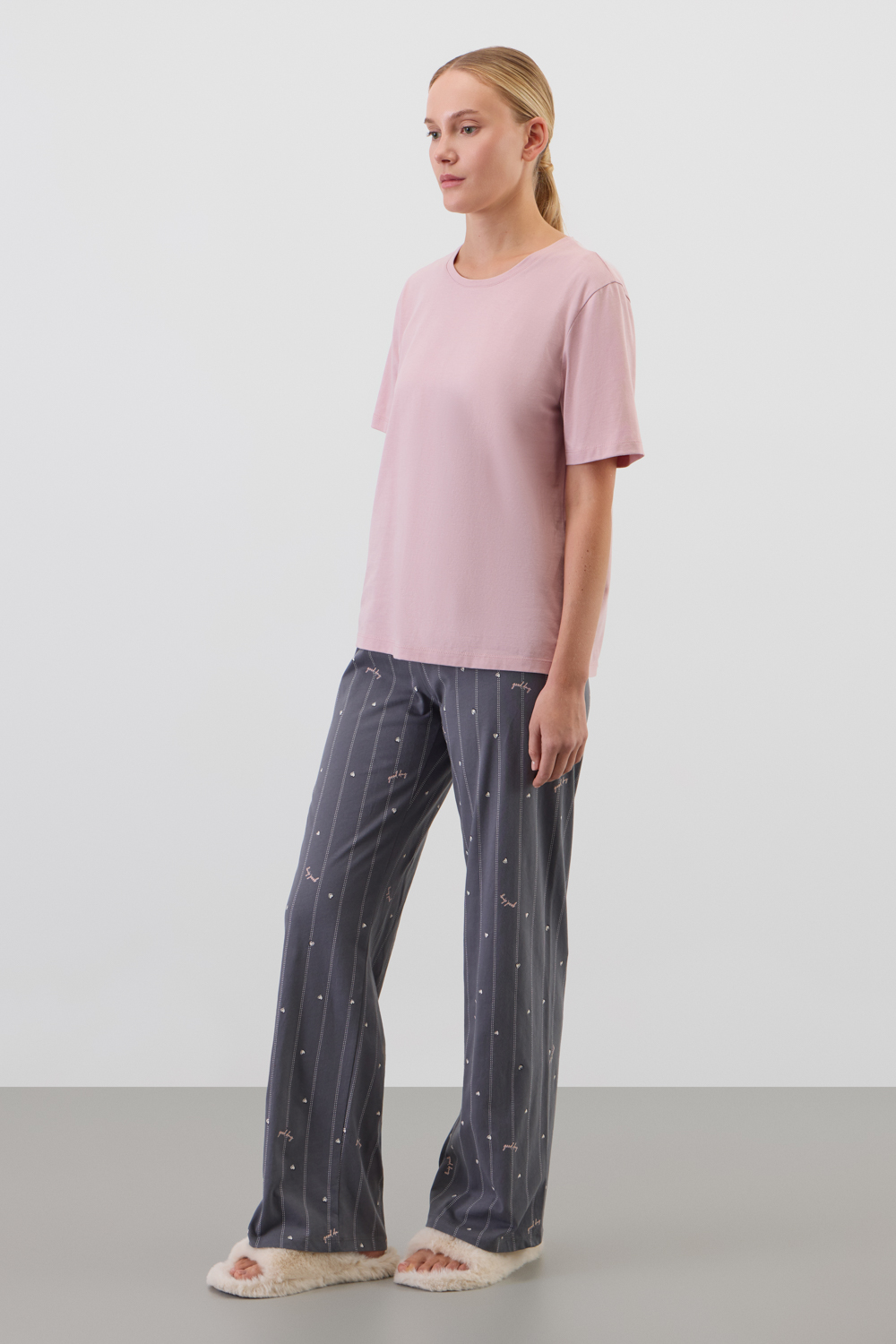 Пижама из 100% хлопка — это идеальный выбор для комфортного сна и отдыха. Комплект выполнен из мягкого и дышащего материала, который обеспечивает приятные тактильные ощущения и комфорт в течение всей ночи.Пижама состоит из футболки с короткими рукавами и брюк прямого кроя. Свободная футболка имеет круглую горловину, которая обеспечивает лёгкость движений и не сковывает тело. Брюки оснащены эластичным поясом, обеспечивающим комфорт и свободу движений.Комплект выполнен в спокойных, нейтральных тонах, которые легко впишутся в любой интерьер спальни или гостиной. Лёгкий принт на брюках добавляет образу изюминку, не перегружая его. Эта домашняя одежда подойдёт как для сна, так и для повседневных дел — она не теряет форму после стирки, не вызывает аллергии и сохраняет первоначальную мягкость даже при длительном использовании. Практичный и стильный комплект станет незаменимой частью вашего домашнего гардероба, даря ощущение уюта и расслабленности каждый день.