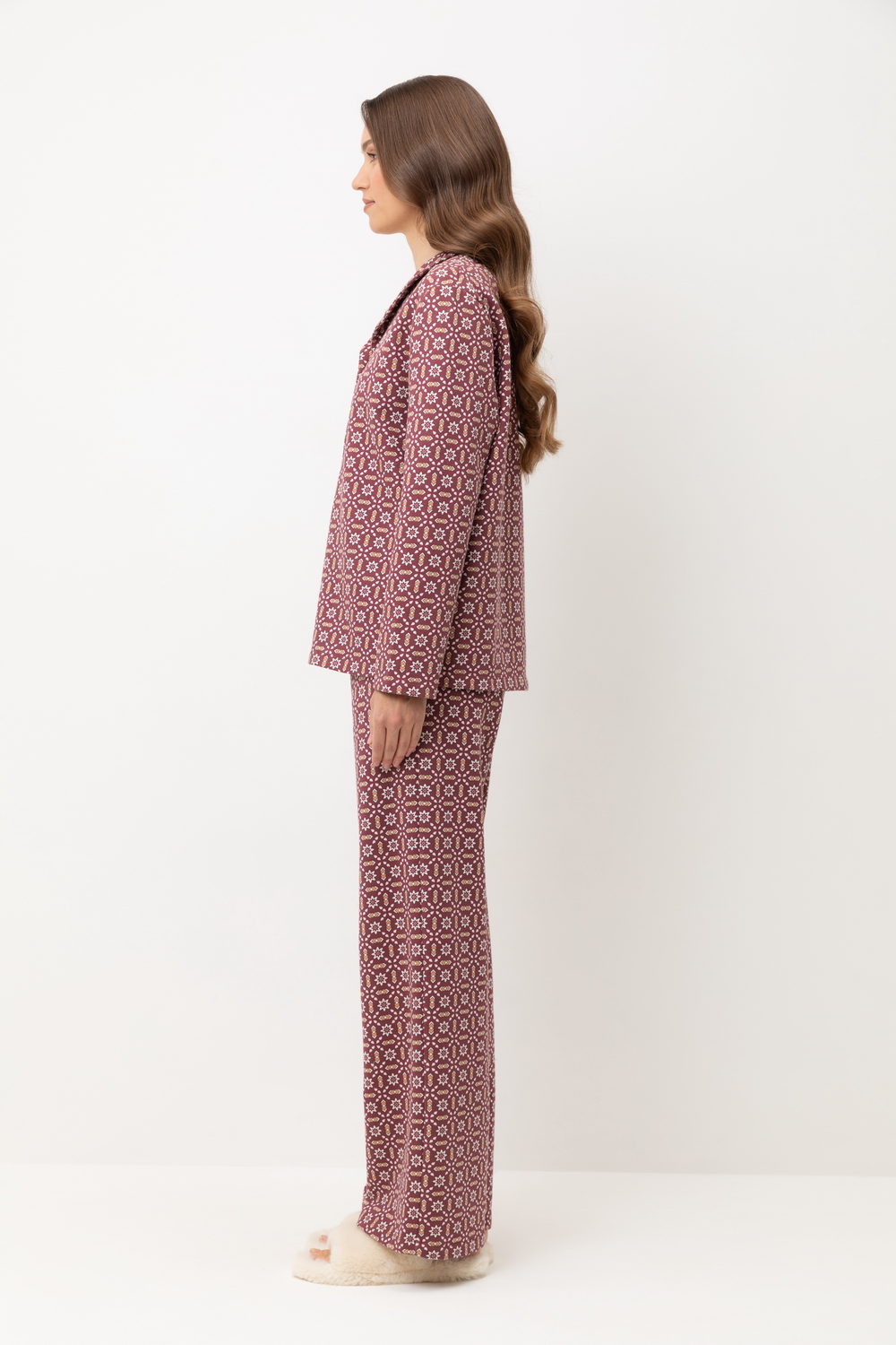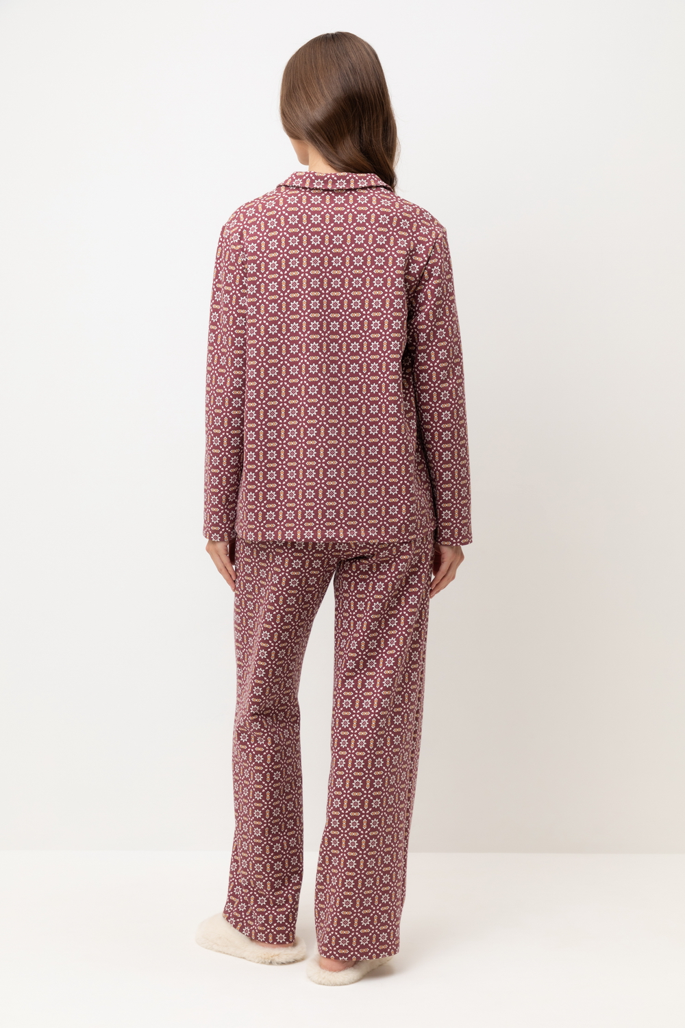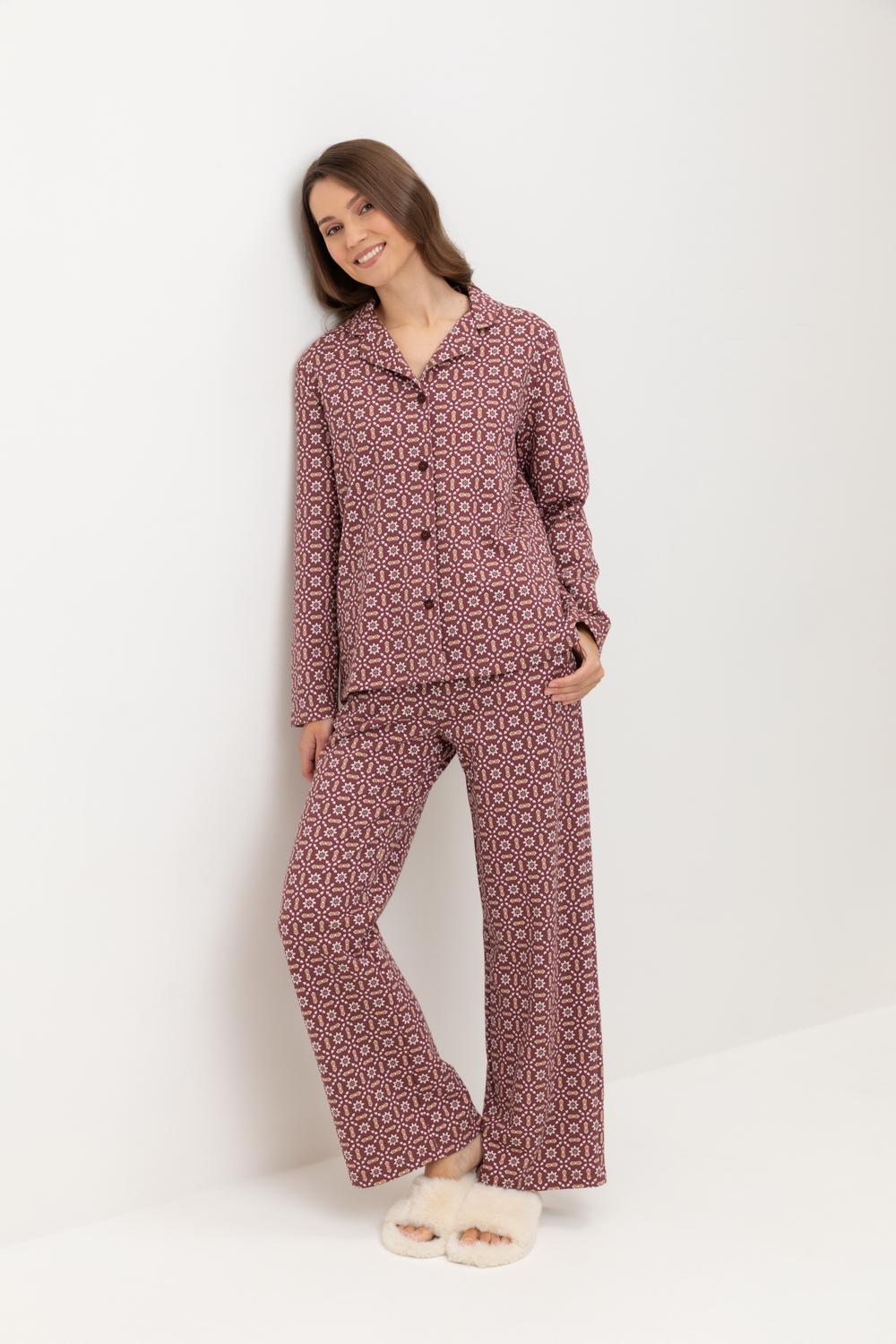 Женский хлопковый пижамный комплект из рубашки и брюк — это идеальный выбор для комфортного сна и отдыха. Комплект выполнен из 100% хлопка, что обеспечивает мягкость, воздухопроницаемость и приятные ощущения на коже. Рубашка с длинными рукавами и воротником на пуговицах имеет свободный крой, что позволяет чувствовать себя комфортно в течение всей ночи. Брюки прямого силуэта дополняют образ, создавая удобство и стиль. Универсальный цвет с геометрическим узором придаёт комплекту элегантность и многофункциональность, позволяя сочетать его с другими элементами домашнего гардероба. Этот комплект станет отличным подарком для себя или близких, обеспечивая уют и комфорт в любое время года.