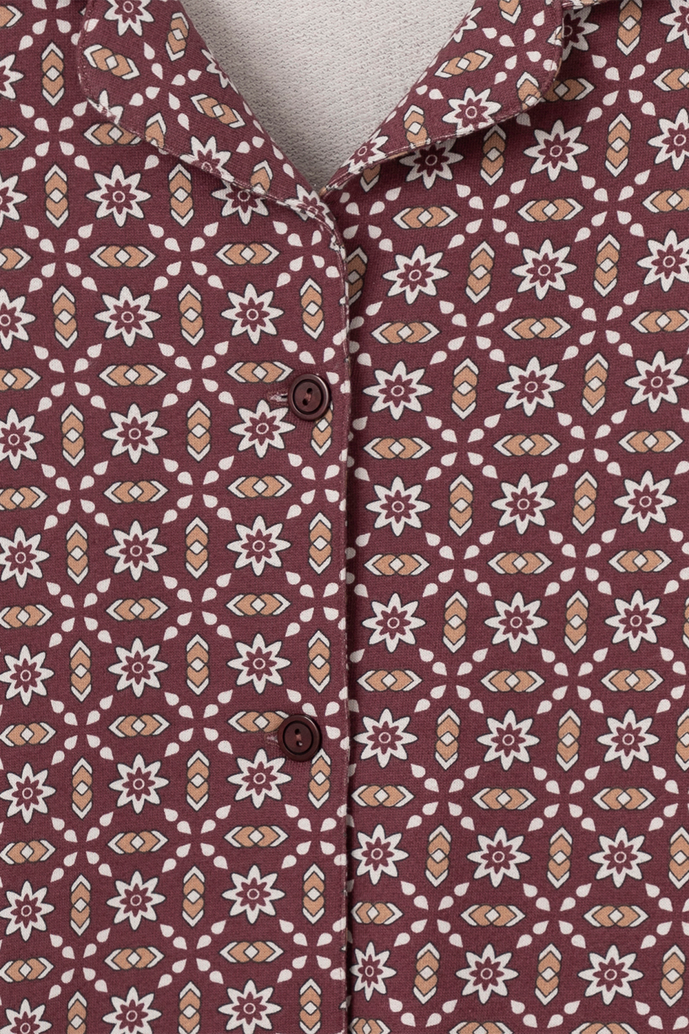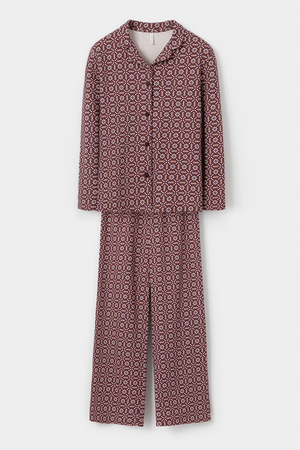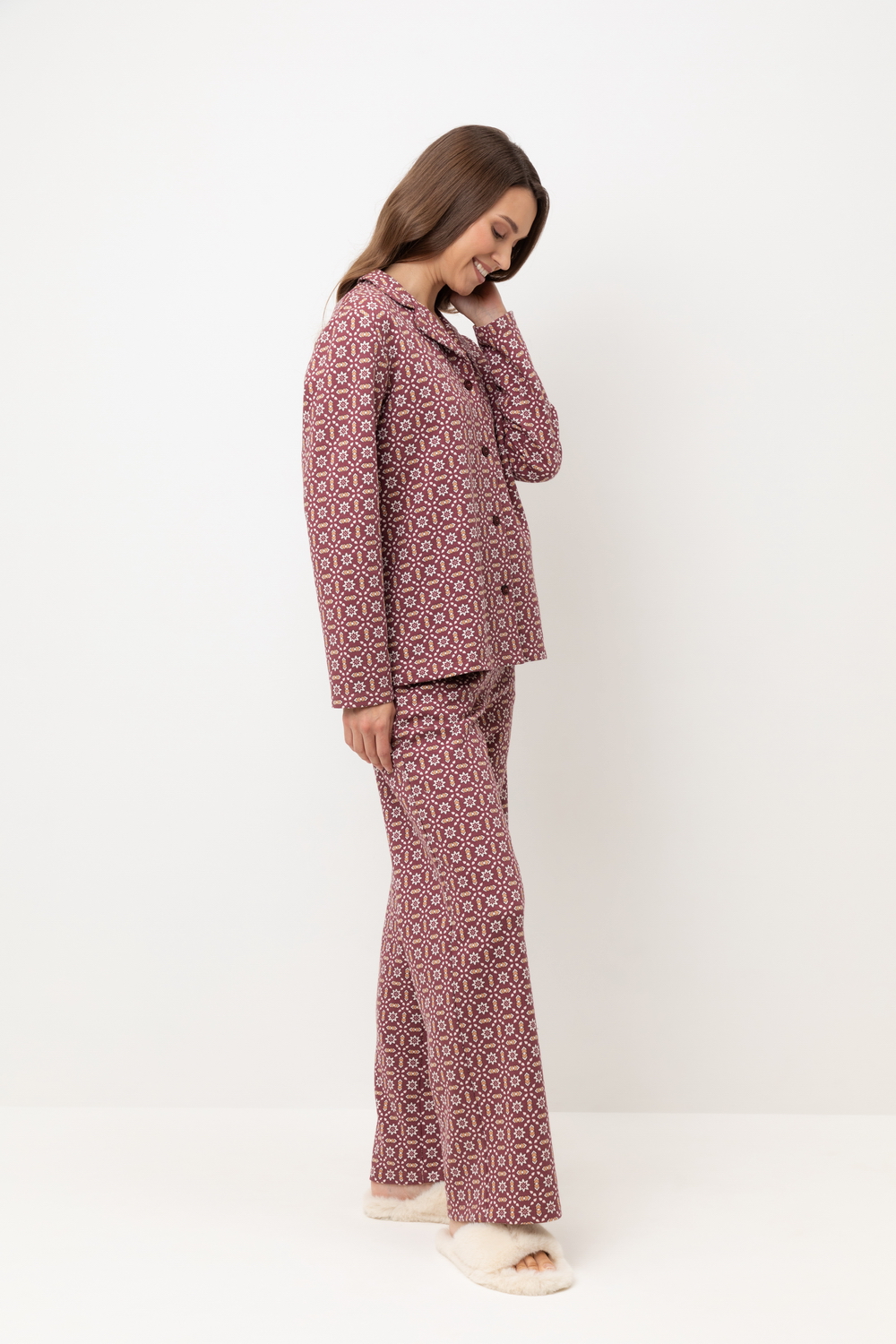 Женский хлопковый пижамный комплект из рубашки и брюк — это идеальный выбор для комфортного сна и отдыха. Комплект выполнен из 100% хлопка, что обеспечивает мягкость, воздухопроницаемость и приятные ощущения на коже. Рубашка с длинными рукавами и воротником на пуговицах имеет свободный крой, что позволяет чувствовать себя комфортно в течение всей ночи. Брюки прямого силуэта дополняют образ, создавая удобство и стиль. Универсальный цвет с геометрическим узором придаёт комплекту элегантность и многофункциональность, позволяя сочетать его с другими элементами домашнего гардероба. Этот комплект станет отличным подарком для себя или близких, обеспечивая уют и комфорт в любое время года.