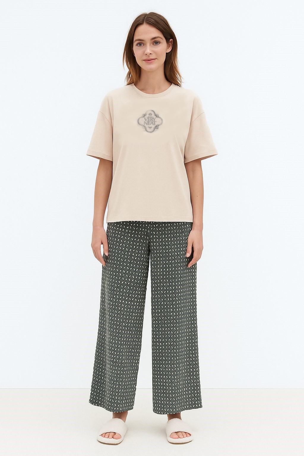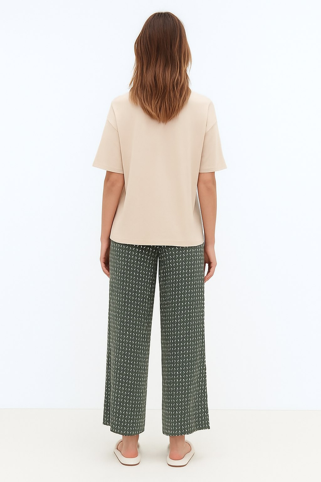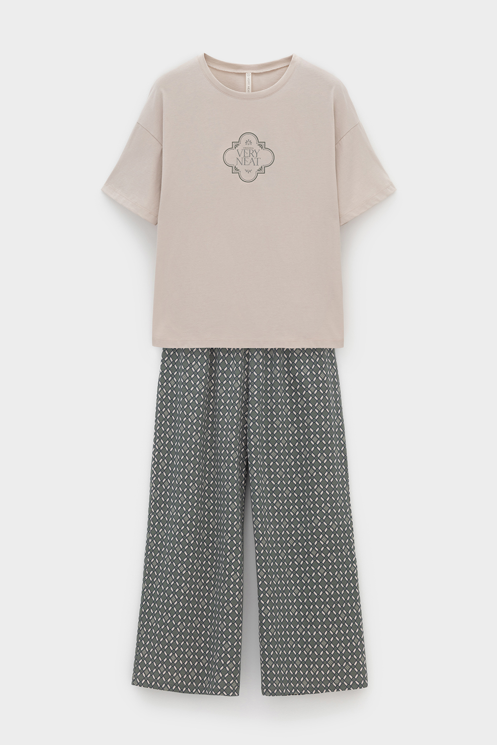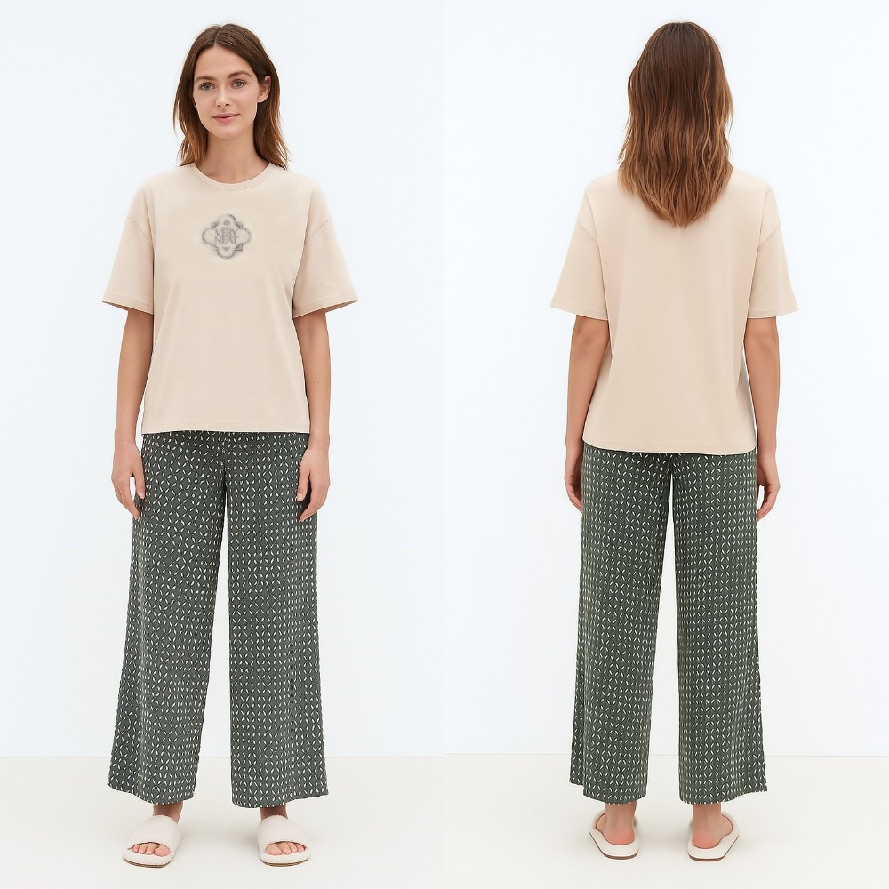 Комплект футболка и брюки из 100% хлопка — идеальный выбор для домашнего уюта и повседневной носки, отличается мягкостью и приятной на ощупь текстурой, благодаря натуральному составу обеспечивает отличную воздухопроницаемость и комфорт в течение всего дня, футболка свободного кроя с коротким рукавом и округлым вырезом гармонично сочетается с широкими брюками, удобный пояс на резинке надёжно фиксирует брюки на талии, не сдавливая и не сковывая движения, практичные карманы на брюках позволяют хранить под рукой мелкие предметы. Натуральный хлопок гипоаллергенен, не вызывает раздражения кожи, сохраняет форму и цвет даже после множества стирок, комплект подойдёт для сна, отдыха, домашних дел, станет незаменимой частью базового гардероба, сочетает в себе стиль, удобство и высокое качество материалов.