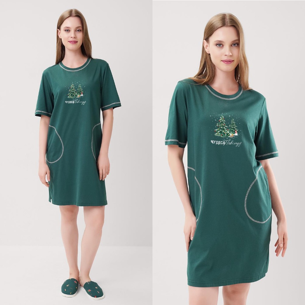 Туника (платье) для дома и отдыха выполнено из мягкого хлопкового трикотажного полотна, что делает его идеальным для комфортного ношения. Прямой силуэт подчеркивает естественную красоту фигуры, а короткий втачной рукав добавляет легкости и удобства. Округлая горловина с обтачкой обеспечивает аккуратный вид, а боковые карманы делают платье практичным для повседневного использования. Низ рукава, обтачка горловины и карманы обработаны застилом, что придает изделию дополнительную прочность и стиль. Боковой разрез обеспечивает свободу движений, а принт на передней части добавляет оригинальности и уюта.