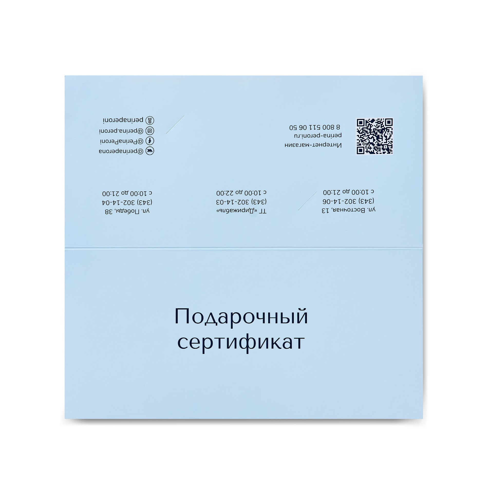 Пластиковая подарочная карта Перина Перони оформлена в праздничную открытку и конверт. Накануне любого праздника каждый человек озадачен выбором не только приятного, но и полезного подарка. Наши эксперты по снам предлагают совместить оба критерия и выбрать в качестве презента подарочный сертификат от сети салонов Перина Перони. Обратите внимание! Применение промокодов, использование бонусов и оплата другими сертификатами недоступны при покупке подарочных карт.