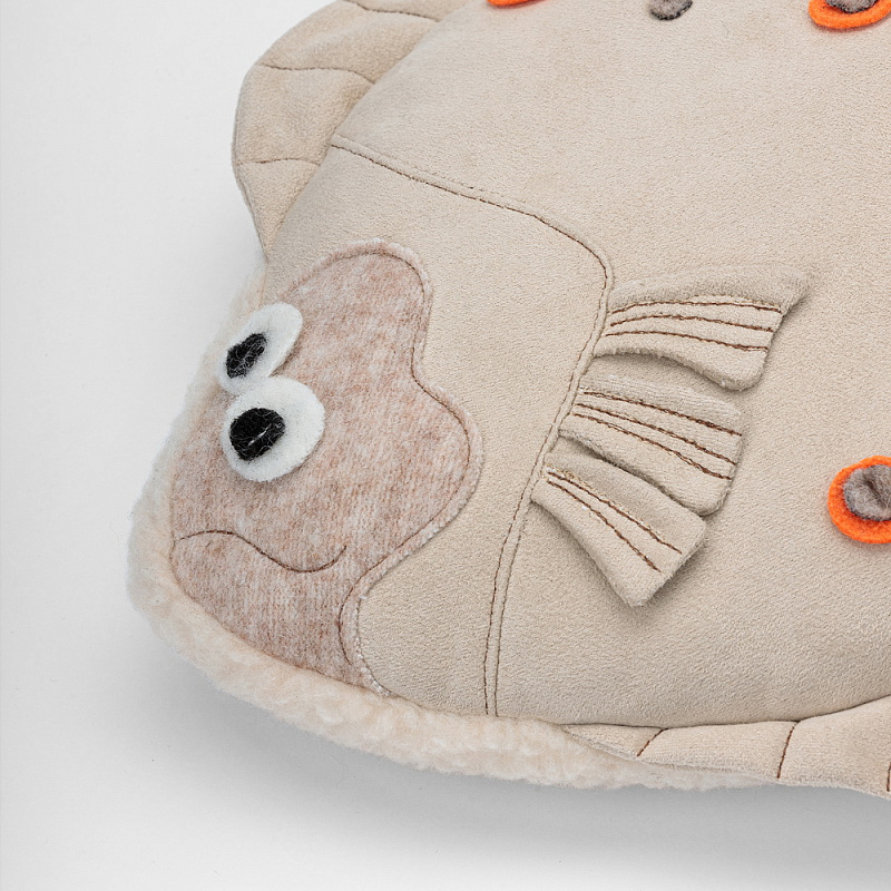 Эта мягкая декоративная подушка в виде очаровательной камбалы по имени Алла привнесёт в ваш дом нотку игривого уюта и станет оригинальным акцентом в любом интерьере. Выполненная с особой тщательностью, эта милая вещица изготовлена из высококачественного трикотажного полотна смесового состава, а с одной стороны дополнена мягким мехом с чистошерстяным ворсом — благодаря этому подушечка невероятно приятна на ощупь с обеих сторон.Особенность модели — изысканная авторская аппликация, аккуратно выполненная на швейной машине: детали рыбки проработаны с любовью, а яркие акценты в виде «пятнышек» придают изделию особый шарм и делают его по-настоящему уникальным. Но эта подушечка не только украшение! Практичность сочетается с эстетикой: вы можете использовать её двумя способами. Во-первых, как декоративный элемент — разместите на диване, кресле или детской кроватке, чтобы добавить пространству индивидуальности. Во-вторых, подушечку легко превратить в удобный валик для шеи: просто скрутите её в рулончик.