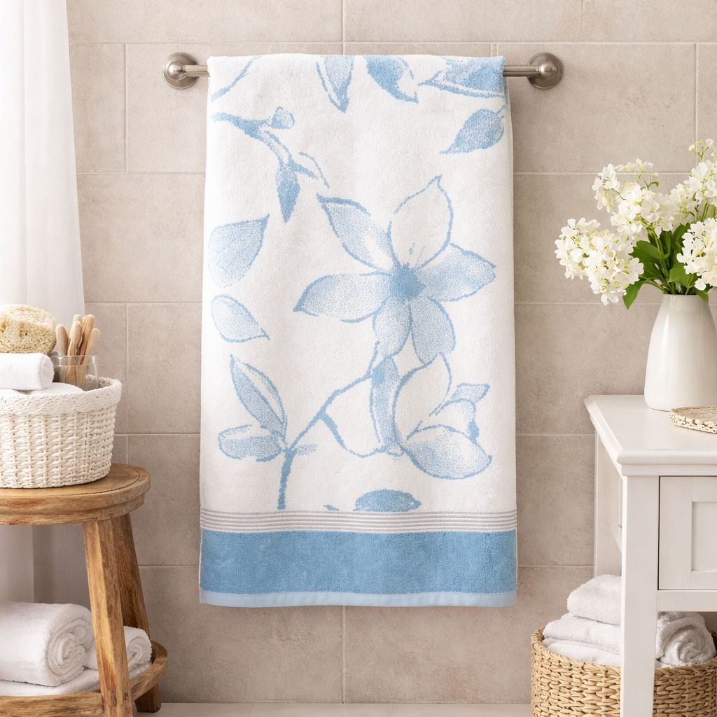 Махровое пестротканое полотенце выполнено из натуральной смесовой пряжи (60% бамбук + 40% хлопок). Бамбук в составе этого изделия отвечает за антибактериальные свойства и долговечность: оно не линяет после стирки и хорошо держит форму, сохраняя при этом свою мягкость. Изделие украшено приятным глазу растительным принтом и выполнено в сочетании белого цвета и зеленого оттенка «туманный папоротник». Благодаря разработке (чередованию петель двух основных цветов) в принте создается визуальный эффект дополнительного оттенка. В нижней части изделие украшено саржевыми косичками зеленого оттенка хэмлок. Полотенце имеет петельку из репсовой ленты для удобного хранения в ванной.