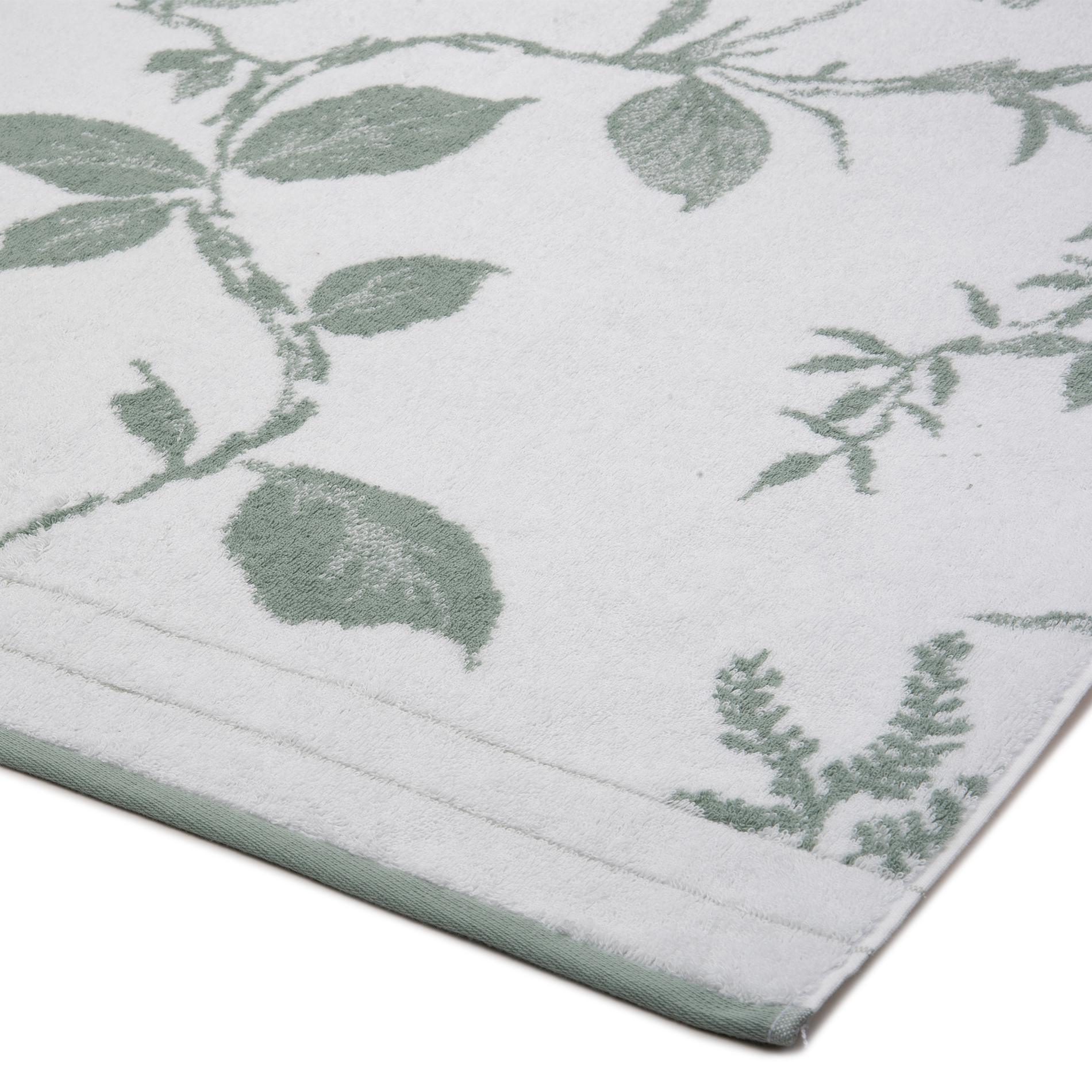 Махровое пестротканое полотенце выполнено из натуральной смесовой пряжи (60% бамбук + 40% хлопок). Бамбук в составе этого изделия отвечает за антибактериальные свойства и долговечность: оно не линяет после стирки и хорошо держит форму, сохраняя при этом свою мягкость. Изделие украшено приятным глазу растительным принтом и выполнено в сочетании белого цвета и зеленого оттенка «туманный папоротник». Благодаря разработке (чередованию петель двух основных цветов) в принте создается визуальный эффект дополнительного оттенка. В нижней части изделие украшено саржевыми косичками зеленого оттенка хэмлок. Полотенце имеет петельку из репсовой ленты для удобного хранения в ванной.