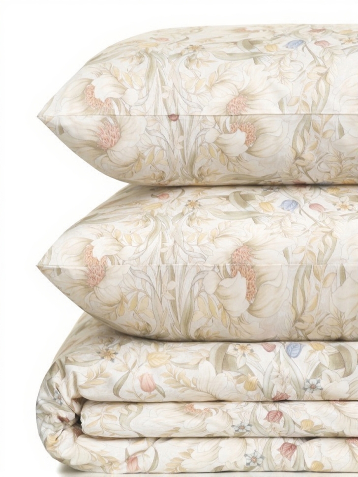 Перкаль изготавливается из 100% хлопка, собранного вручную, что придает ему дополнительную нежность и гладкость. Благодаря реактивному окрашиванию, рисунок белья выглядит ярким и насыщенным, не теряя своей свежести даже после многократных стирок.