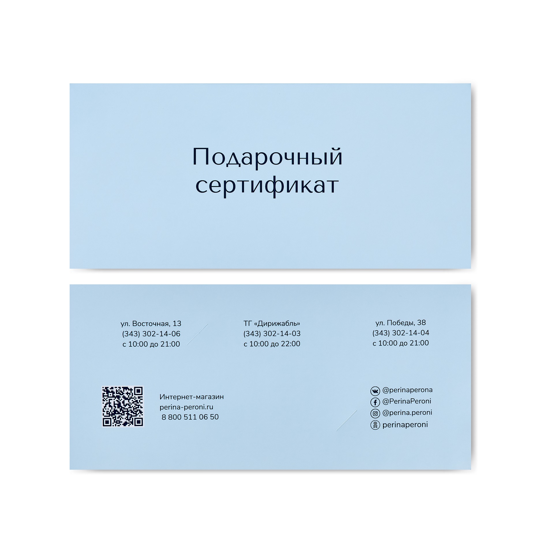 Пластиковая подарочная карта Перина Перони оформлена в праздничную открытку и конверт. Накануне любого праздника каждый человек озадачен выбором не только приятного, но и полезного подарка. Наши эксперты по снам предлагают совместить оба критерия и выбрать в качестве презента подарочный сертификат от сети салонов Перина Перони. Обратите внимание! Применение промокодов, использование бонусов и оплата другими сертификатами недоступны при покупке подарочных карт.