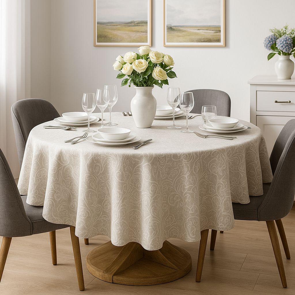 Благодаря специальному покрытию тефлоновые скатерти очень практичны и удобны в использовании. Такие скатерти не боятся капель, жирных пятен, грязи. Мягкая жаккардовая ткань прекрасно обрамляет стол и делает его уютным на кухне, торжественным в банкетном зале, стильным в столовой и гостиной. Специальное покрытие не позволит скатерти съезжать со стола, а водоотталкивающие свойства тефлона помогут надолго сохранить внешний вид вашей скатерти, облегчить уход за ней и продлить срок эксплуатации.