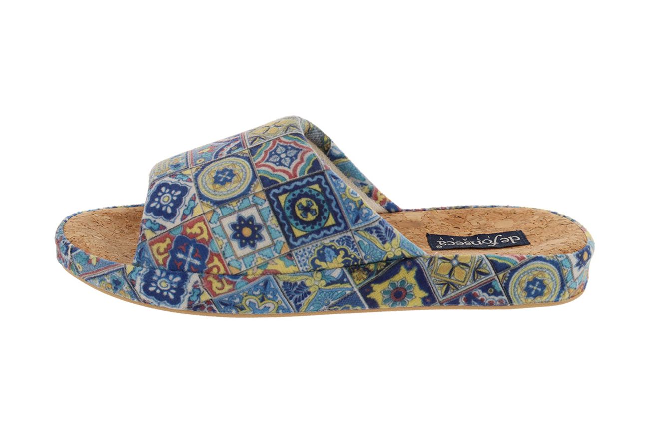 Легкие и изысканные открытые домашние тапки в сине‑голубой гамме с узором, вдохновлённым марокканской мозаикой. Мягкий велюровый текстиль приятен на ощупь и придаёт модели уютный, элегантный вид, а открытый фасон делает тапки идеальными для тех, кто ценит свободу движений. Пробковая стелька с анатомическим профилем обеспечивает естественную поддержку стопы, амортизацию и комфорт при длительной носке; мягкая велюровая поверхность дарит приятные тактильные ощущения и аккуратный внешний вид; узоры в стиле марокканской мозаики делают модель яркой, но в то же время изысканной — универсально подходят к домашнему гардеробу; надёжная резиновая подошва с хорошим сцеплением обеспечивает устойчивость и долговечность. Итальянская компания De Fonseca - мировой лидер в производстве качественной обуви для дома. Главные преимущества компании-безупречный стиль модельеров Италии и новейшие технологии для комфорта и здоровья Ваших ног.