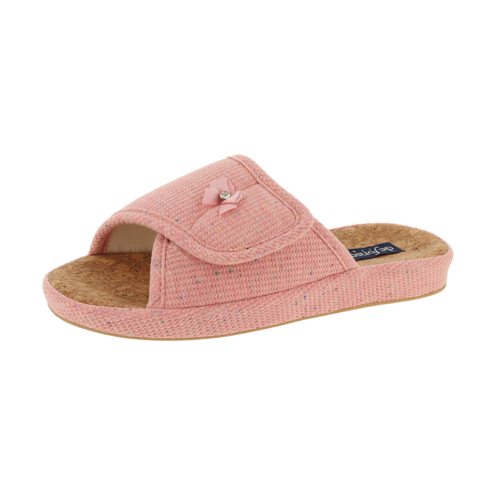 Женские домашние тапочки De Fonseca — сочетание уюта, стиля и практичности для ежедневных комфортных прогулок по дому. Модель выполнена в нежном розовом оттенке с мелкими разноцветными вкраплениями, которые придают изделию особый шарм и лёгкую игривость. Верх тапочек изготовлен из мягкой текстильной ткани, которая приятна на ощупь, не вызывает раздражения и обеспечивает хорошую воздухопроницаемость,Главная «изюминка» — стелька и подошва из натуральной пробки. Пробковая подошва не только выглядит эстетично, но и обладает рядом преимуществ: она гибкая, амортизирует нагрузку на стопу, снижает усталость ног после длительного ношения. апочки идеально подойдут для использования дома, на даче или в спа-зоне — они лёгкие, не скользят на гладких поверхностях, обеспечивают комфорт даже при длительном ношении.