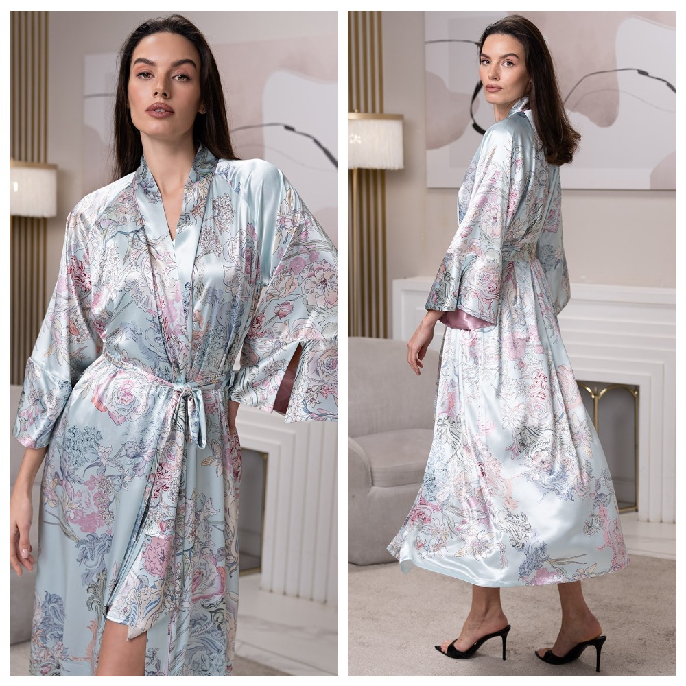 Длинный запашной халат Mia-Amore Gabriel выполнен из смесового шелка с флористическим принтом - воплощение элегантности, утонченности и нежности. Нежно-бирюзовый оттенок придает образу свежесть и легкость, а контрастная внутренняя отделка рукава в розовом цвете добавляют нотку романтики и изысканности. Коллекция идеально подходит для особых моментов, подчеркивая красоту и уверенность своей обладательницы. Халат имеет широкие длинные рукава, по бокам практичные карманы, линию талии можно подчеркнуть за счет пояса в комплекте. Благодаря составу (70% шелк, 25% полиэстер, 5% эластан) халат подарит приятные тактильные ощущения и комфорт в носке: прохладная на ощупь, легкая и невесомая ткань практически не чувствуется на теле. Благодаря продуманному крою и качественным материалам, изделие красиво драпируется, подчеркивая женственность образа.